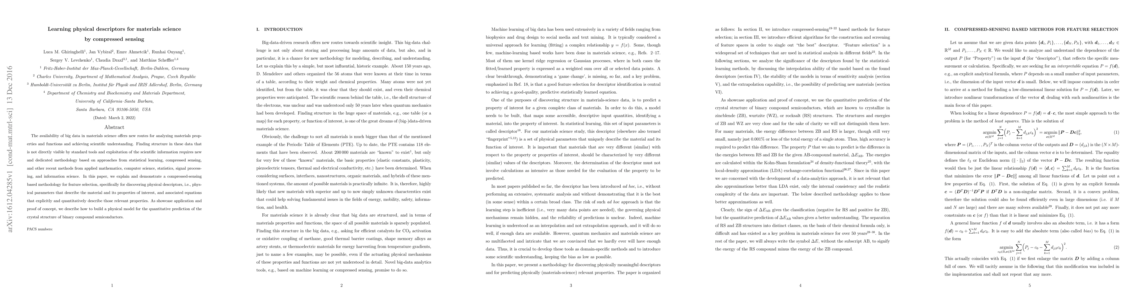 The availability of big data in materials science offers new routes for analyzing materials properties and functions and achieving scientific understanding. Finding structure in these data that is not directly visible by standard tools and exploitation of the scientific information requires new and dedicated methodology based on approaches from statistical learning, compressed sensing, and other recent methods from applied mathematics, computer science, statistics, signal processing, and information science. In this paper, we explain and demonstrate a compressed-sensing based methodology for feature selection, specifically for discovering physical descriptors, i.e., physical parameters that describe the material and its properties of interest, and associated equations that explicitly and quantitatively describe those relevant properties. As showcase application and proof of concept, we describe how to build a physical model for the quantitative prediction of the crystal structure of binary compound semiconductors.