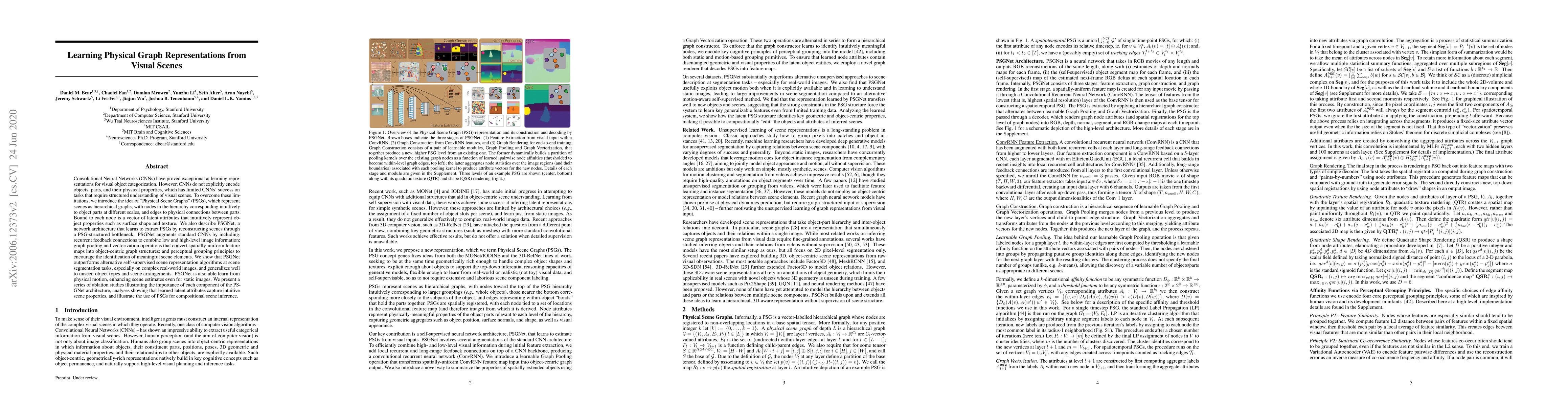 This paper introduces Physical Scene Graphs (PSGs) to represent visual scenes as hierarchical graphs, addressing CNNs' limitations in structured scene understanding. PSGNet, a novel network architecture, learns PSGs by reconstructing scenes, incorporating recurrent feedback, graph operations, and perceptual grouping. PSGNet outperforms alternative algorithms in scene segmentation and generalizes well, demonstrating the effectiveness of learned latent attributes and compositional scene inference.