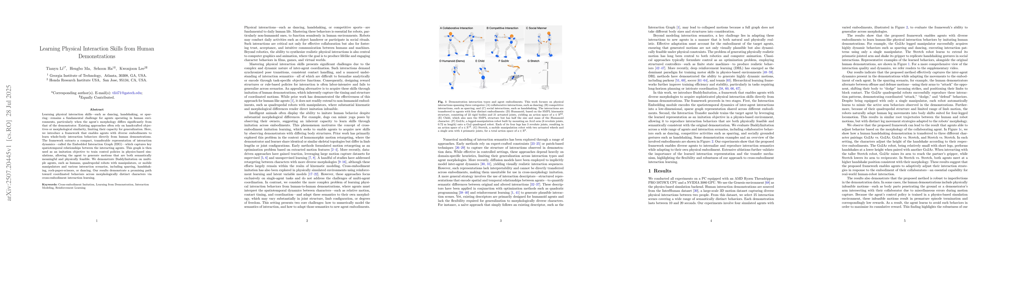The research introduces BuddyImitation, an imitation learning framework that enables diverse agents to acquire physical interaction skills from human demonstrations. It comprises two key learning components: Interaction Embedding Module and Interaction Transfer Module. The former learns a sparse, low-dimensional representation of interaction dynamics, while the latter transfers demonstrated interactions to new agents using reinforcement learning in physics-based simulations.
