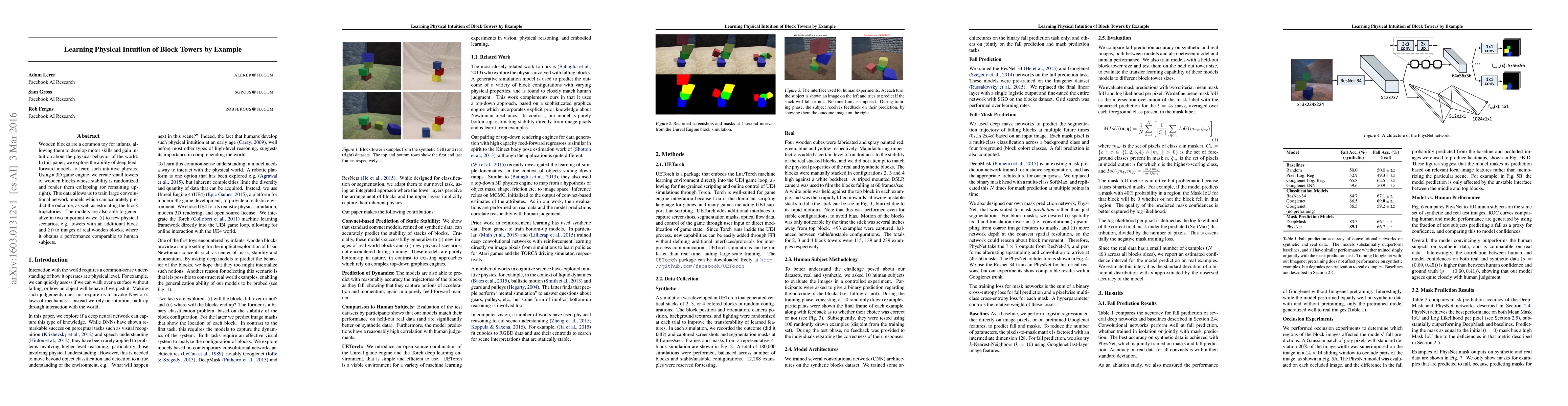 Wooden blocks are a common toy for infants, allowing them to develop motor skills and gain intuition about the physical behavior of the world. In this paper, we explore the ability of deep feed-forward models to learn such intuitive physics. Using a 3D game engine, we create small towers of wooden blocks whose stability is randomized and render them collapsing (or remaining upright). This data allows us to train large convolutional network models which can accurately predict the outcome, as well as estimating the block trajectories. The models are also able to generalize in two important ways: (i) to new physical scenarios, e.g. towers with an additional block and (ii) to images of real wooden blocks, where it obtains a performance comparable to human subjects.