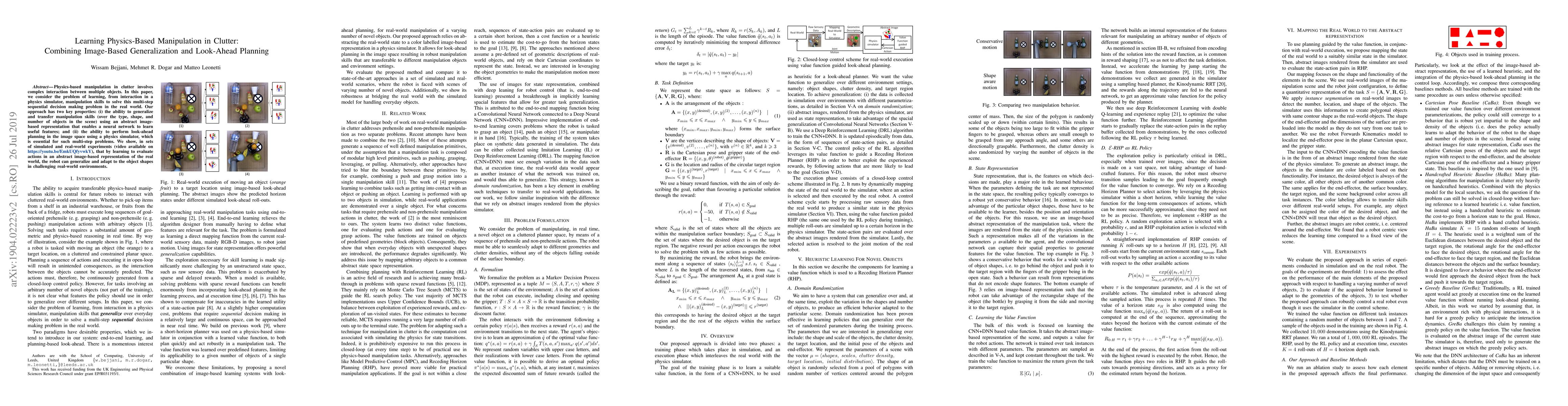 Physics-based manipulation in clutter involves complex interaction between multiple objects. In this paper, we consider the problem of learning, from interaction in a physics simulator, manipulation skills to solve this multi-step sequential decision making problem in the real world. Our approach has two key properties: (i) the ability to generalize and transfer manipulation skills (over the type, shape, and number of objects in the scene) using an abstract image-based representation that enables a neural network to learn useful features; and (ii) the ability to perform look-ahead planning in the image space using a physics simulator, which is essential for such multi-step problems. We show, in sets of simulated and real-world experiments (video available on https://youtu.be/EmkUQfyvwkY), that by learning to evaluate actions in an abstract image-based representation of the real world, the robot can generalize and adapt to the object shapes in challenging real-world environments.