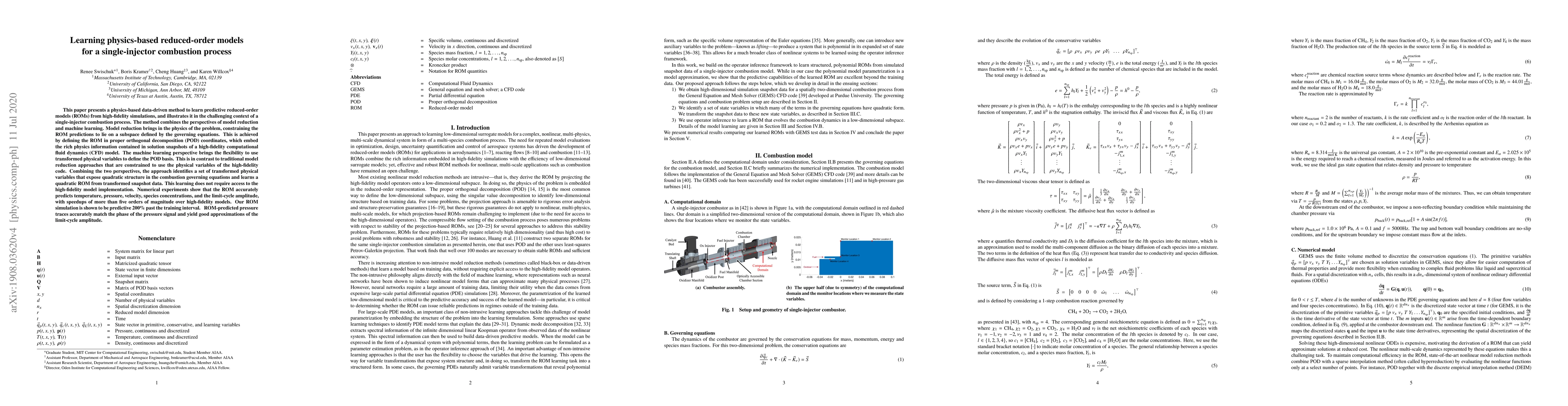 This paper develops a physics-based data-driven reduced-order model (ROM) for a single-injector combustion process, combining model reduction and machine learning to achieve high accuracy and significant speedups over high-fidelity simulations. The ROM, defined in proper orthogonal decomposition coordinates, leverages transformed physical variables for enhanced predictive capability.