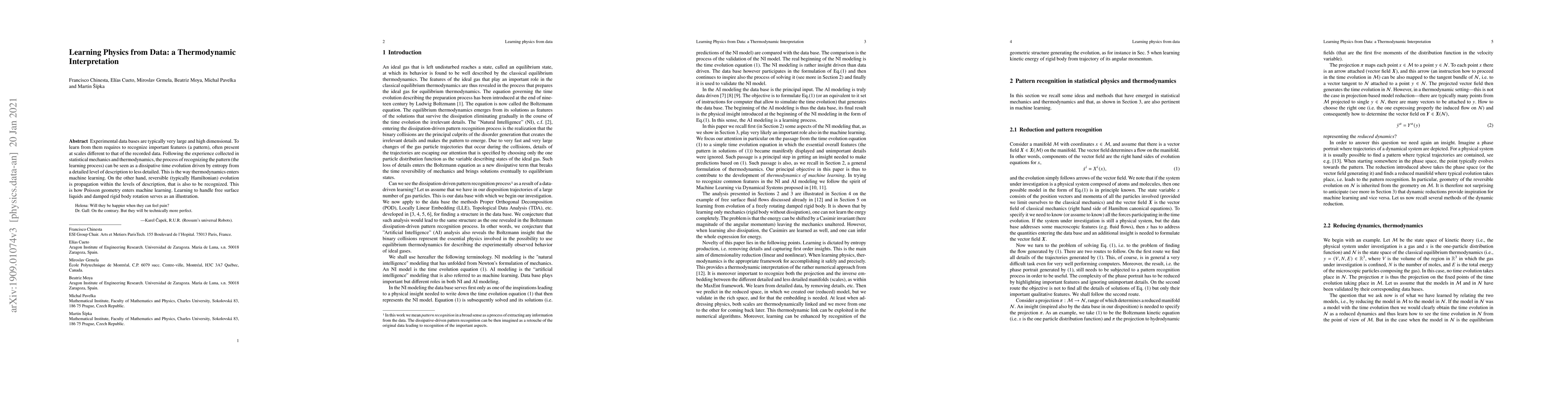 Experimental data bases are typically very large and high dimensional. To learn from them requires to recognize important features (a pattern), often present at scales different to that of the recorded data. Following the experience collected in statistical mechanics and thermodynamics, the process of recognizing the pattern (the learning process) can be seen as a dissipative time evolution driven by entropy from a detailed level of description to less detailed. This is the way thermodynamics enters machine learning. On the other hand, reversible (typically Hamiltonian) evolution is propagation within the levels of description, that is also to be recognized. This is how Poisson geometry enters machine learning. Learning to handle free surface liquids and damped rigid body rotation serves as an illustration.