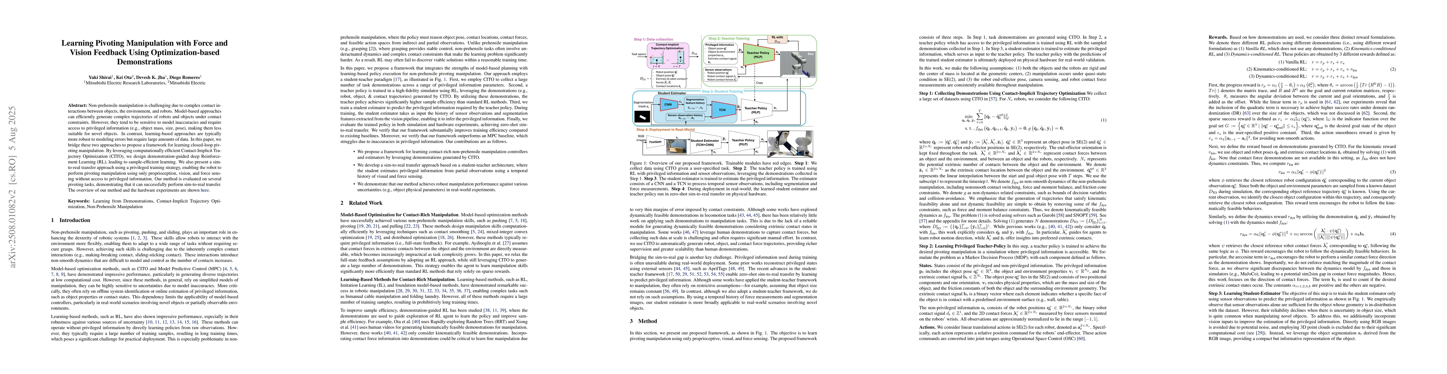 Non-prehensile manipulation is challenging due to complex contact interactions between objects, the environment, and robots. Model-based approaches can efficiently generate complex trajectories of robots and objects under contact constraints. However, they tend to be sensitive to model inaccuracies and require access to privileged information (e.g., object mass, size, pose), making them less suitable for novel objects. In contrast, learning-based approaches are typically more robust to modeling errors but require large amounts of data. In this paper, we bridge these two approaches to propose a framework for learning closed-loop pivoting manipulation. By leveraging computationally efficient Contact-Implicit Trajectory Optimization (CITO), we design demonstration-guided deep Reinforcement Learning (RL), leading to sample-efficient learning. We also present a sim-to-real transfer approach using a privileged training strategy, enabling the robot to perform pivoting manipulation using only proprioception, vision, and force sensing without access to privileged information. Our method is evaluated on several pivoting tasks, demonstrating that it can successfully perform sim-to-real transfer.