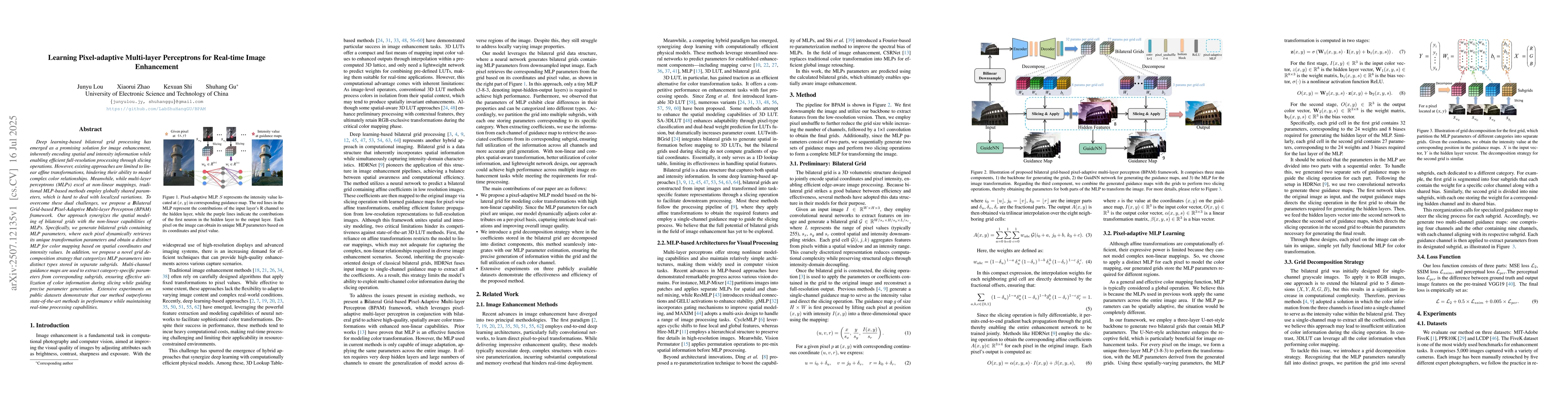Deep learning-based bilateral grid processing has emerged as a promising solution for image enhancement, inherently encoding spatial and intensity information while enabling efficient full-resolution processing through slicing operations. However, existing approaches are limited to linear affine transformations, hindering their ability to model complex color relationships. Meanwhile, while multi-layer perceptrons (MLPs) excel at non-linear mappings, traditional MLP-based methods employ globally shared parameters, which is hard to deal with localized variations. To overcome these dual challenges, we propose a Bilateral Grid-based Pixel-Adaptive Multi-layer Perceptron (BPAM) framework. Our approach synergizes the spatial modeling of bilateral grids with the non-linear capabilities of MLPs. Specifically, we generate bilateral grids containing MLP parameters, where each pixel dynamically retrieves its unique transformation parameters and obtain a distinct MLP for color mapping based on spatial coordinates and intensity values. In addition, we propose a novel grid decomposition strategy that categorizes MLP parameters into distinct types stored in separate subgrids. Multi-channel guidance maps are used to extract category-specific parameters from corresponding subgrids, ensuring effective utilization of color information during slicing while guiding precise parameter generation. Extensive experiments on public datasets demonstrate that our method outperforms state-of-the-art methods in performance while maintaining real-time processing capabilities.