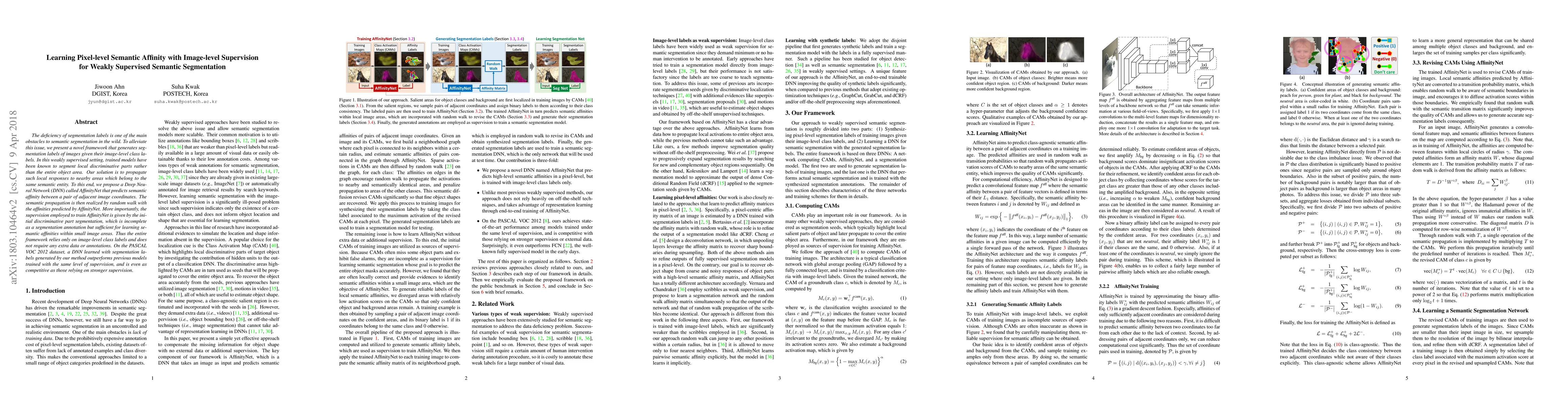 This paper introduces AffinityNet, a Deep Neural Network that predicts pixel-level semantic affinity based on image-level supervision, enabling weakly supervised semantic segmentation. The method propagates local segmentation responses to entire object areas via random walk, achieving competitive performance on the PASCAL VOC 2012 dataset without requiring additional annotations.