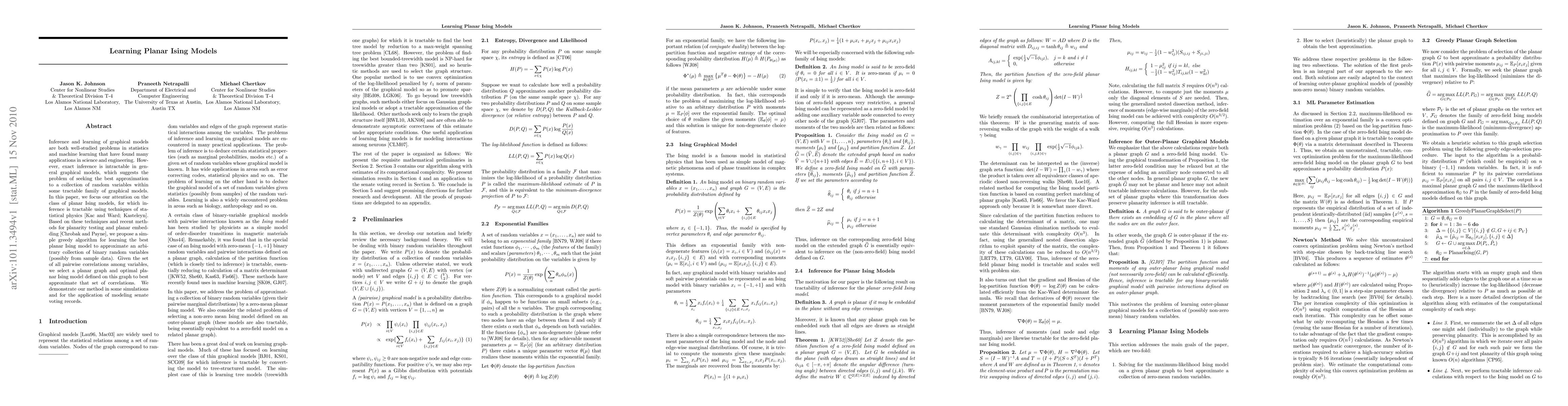 This paper proposes a greedy algorithm for learning the best planar Ising model to approximate binary random variables, leveraging tractable inference techniques and recent planarity testing methods. The method is demonstrated through simulations and applied to model senate voting records.