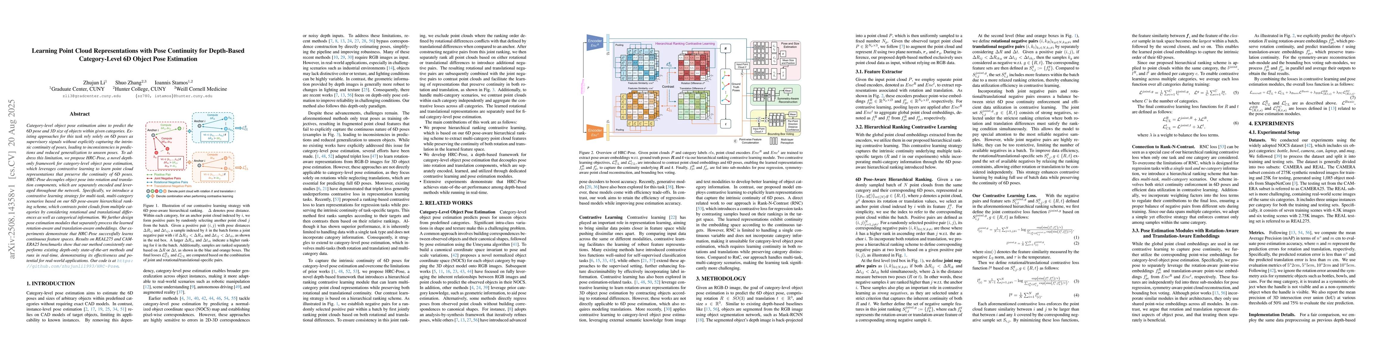 Category-level object pose estimation aims to predict the 6D pose and 3D size of objects within given categories. Existing approaches for this task rely solely on 6D poses as supervisory signals without explicitly capturing the intrinsic continuity of poses, leading to inconsistencies in predictions and reduced generalization to unseen poses. To address this limitation, we propose HRC-Pose, a novel depth-only framework for category-level object pose estimation, which leverages contrastive learning to learn point cloud representations that preserve the continuity of 6D poses. HRC-Pose decouples object pose into rotation and translation components, which are separately encoded and leveraged throughout the network. Specifically, we introduce a contrastive learning strategy for multi-task, multi-category scenarios based on our 6D pose-aware hierarchical ranking scheme, which contrasts point clouds from multiple categories by considering rotational and translational differences as well as categorical information. We further design pose estimation modules that separately process the learned rotation-aware and translation-aware embeddings. Our experiments demonstrate that HRC-Pose successfully learns continuous feature spaces. Results on REAL275 and CAMERA25 benchmarks show that our method consistently outperforms existing depth-only state-of-the-art methods and runs in real-time, demonstrating its effectiveness and potential for real-world applications. Our code is at https://github.com/zhujunli1993/HRC-Pose.