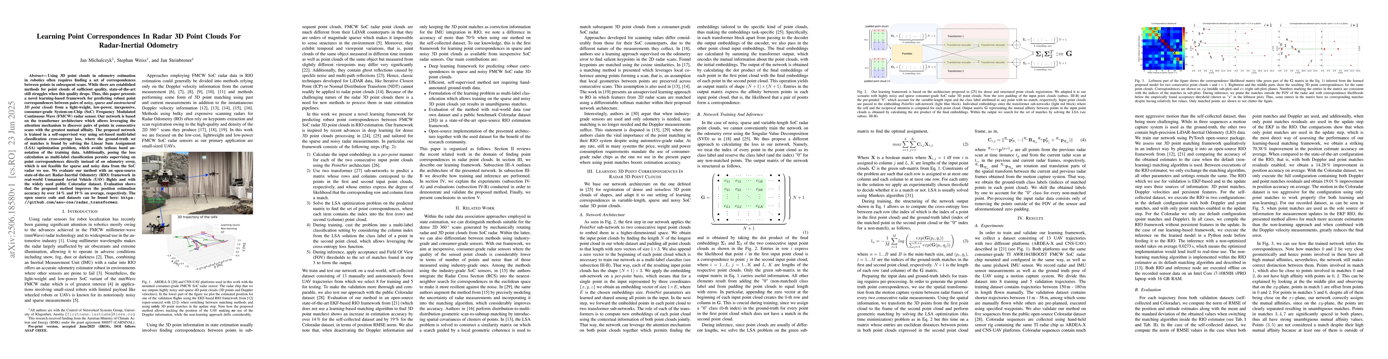 Using 3D point clouds in odometry estimation in robotics often requires finding a set of correspondences between points in subsequent scans. While there are established methods for point clouds of sufficient quality, state-of-the-art still struggles when this quality drops. Thus, this paper presents a novel learning-based framework for predicting robust point correspondences between pairs of noisy, sparse and unstructured 3D point clouds from a light-weight, low-power, inexpensive, consumer-grade System-on-Chip (SoC) Frequency Modulated Continuous Wave (FMCW) radar sensor. Our network is based on the transformer architecture which allows leveraging the attention mechanism to discover pairs of points in consecutive scans with the greatest mutual affinity. The proposed network is trained in a self-supervised way using set-based multi-label classification cross-entropy loss, where the ground-truth set of matches is found by solving the Linear Sum Assignment (LSA) optimization problem, which avoids tedious hand annotation of the training data. Additionally, posing the loss calculation as multi-label classification permits supervising on point correspondences directly instead of on odometry error, which is not feasible for sparse and noisy data from the SoC radar we use. We evaluate our method with an open-source state-of-the-art Radar-Inertial Odometry (RIO) framework in real-world Unmanned Aerial Vehicle (UAV) flights and with the widely used public Coloradar dataset. Evaluation shows that the proposed method improves the position estimation accuracy by over 14 % and 19 % on average, respectively. The open source code and datasets can be found here: https://github.com/aau-cns/radar_transformer.