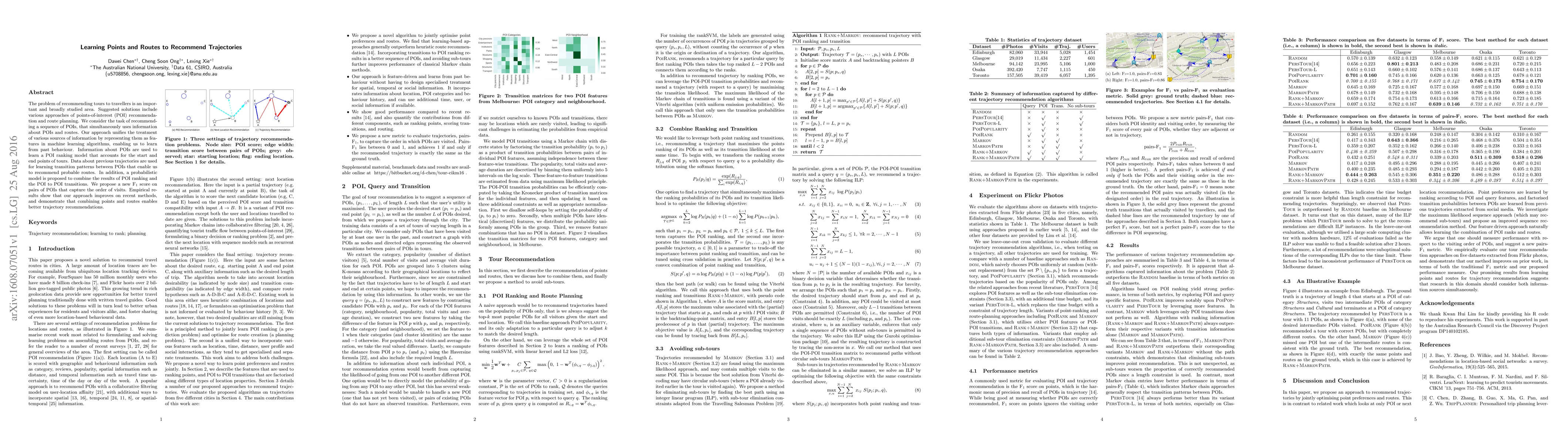 The problem of recommending tours to travellers is an important and broadly studied area. Suggested solutions include various approaches of points-of-interest (POI) recommendation and route planning. We consider the task of recommending a sequence of POIs, that simultaneously uses information about POIs and routes. Our approach unifies the treatment of various sources of information by representing them as features in machine learning algorithms, enabling us to learn from past behaviour. Information about POIs are used to learn a POI ranking model that accounts for the start and end points of tours. Data about previous trajectories are used for learning transition patterns between POIs that enable us to recommend probable routes. In addition, a probabilistic model is proposed to combine the results of POI ranking and the POI to POI transitions. We propose a new F$_1$ score on pairs of POIs that capture the order of visits. Empirical results show that our approach improves on recent methods, and demonstrate that combining points and routes enables better trajectory recommendations.