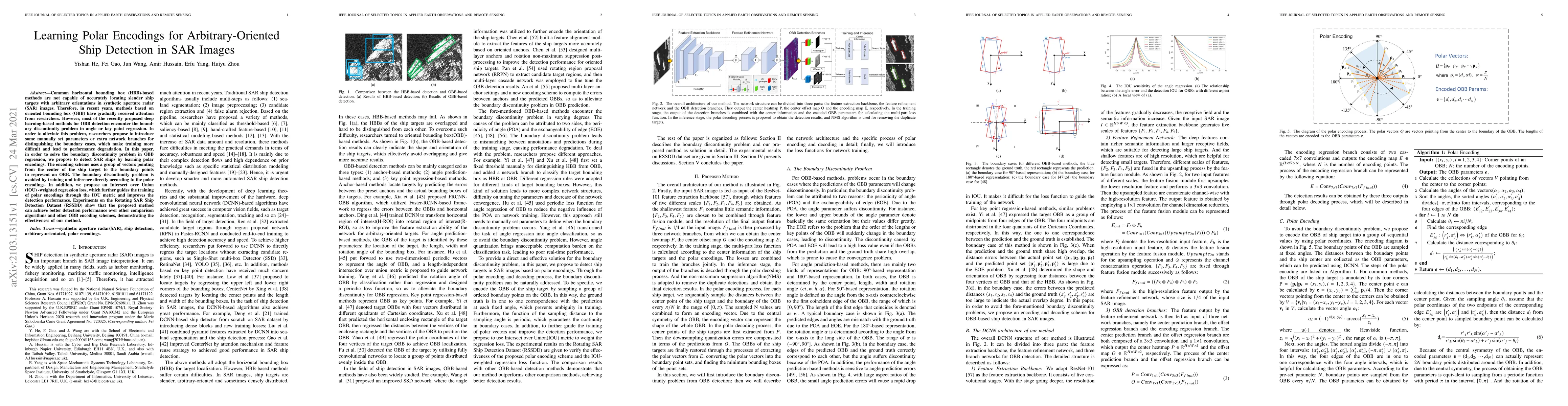 This paper proposes a method to detect ships in SAR images using polar encodings to represent oriented bounding boxes, addressing the boundary discontinuity problem in angle or key point regression. The method employs an IOU-weighted regression loss to improve detection performance, achieving superior results compared to other algorithms on the Rotating SAR Ship Detection Dataset (RSSDD).
