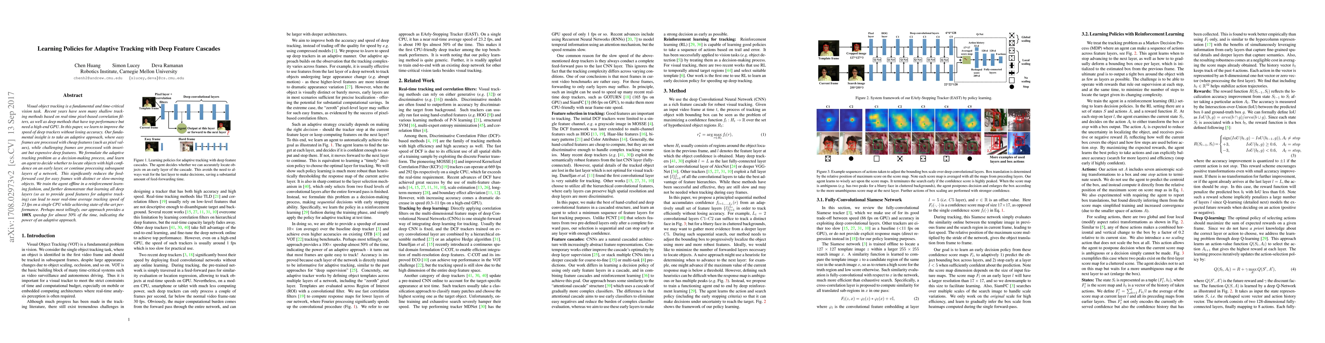 Visual object tracking is a fundamental and time-critical vision task. Recent years have seen many shallow tracking methods based on real-time pixel-based correlation filters, as well as deep methods that have top performance but need a high-end GPU. In this paper, we learn to improve the speed of deep trackers without losing accuracy. Our fundamental insight is to take an adaptive approach, where easy frames are processed with cheap features (such as pixel values), while challenging frames are processed with invariant but expensive deep features. We formulate the adaptive tracking problem as a decision-making process, and learn an agent to decide whether to locate objects with high confidence on an early layer, or continue processing subsequent layers of a network. This significantly reduces the feed-forward cost for easy frames with distinct or slow-moving objects. We train the agent offline in a reinforcement learning fashion, and further demonstrate that learning all deep layers (so as to provide good features for adaptive tracking) can lead to near real-time average tracking speed of 23 fps on a single CPU while achieving state-of-the-art performance. Perhaps most tellingly, our approach provides a 100X speedup for almost 50% of the time, indicating the power of an adaptive approach.