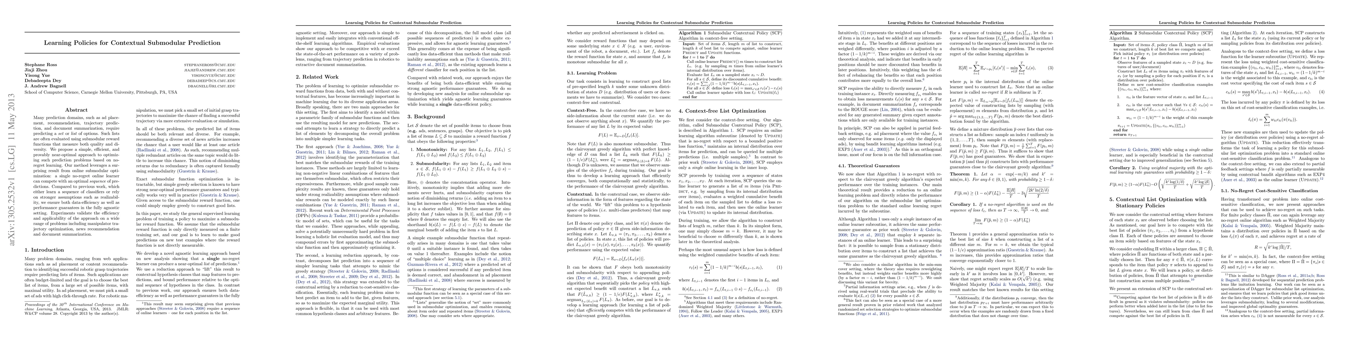 Many prediction domains, such as ad placement, recommendation, trajectory prediction, and document summarization, require predicting a set or list of options. Such lists are often evaluated using submodular reward functions that measure both quality and diversity. We propose a simple, efficient, and provably near-optimal approach to optimizing such prediction problems based on no-regret learning. Our method leverages a surprising result from online submodular optimization: a single no-regret online learner can compete with an optimal sequence of predictions. Compared to previous work, which either learn a sequence of classifiers or rely on stronger assumptions such as realizability, we ensure both data-efficiency as well as performance guarantees in the fully agnostic setting. Experiments validate the efficiency and applicability of the approach on a wide range of problems including manipulator trajectory optimization, news recommendation and document summarization.