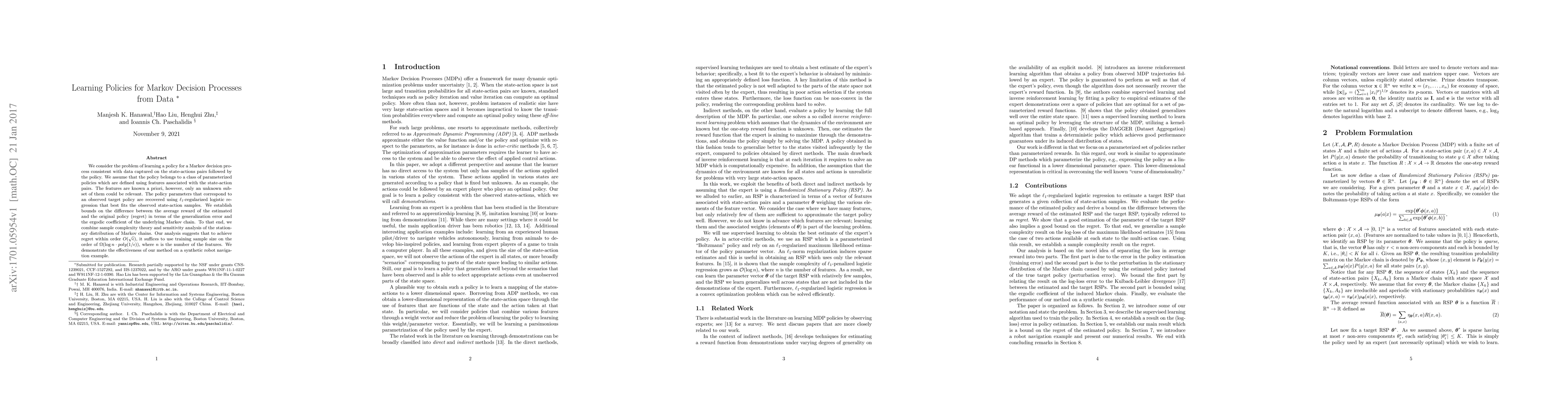 A new method for learning policies in Markov decision processes from data is proposed, which uses $ extit{1}$-regularized logistic regression to estimate policy parameters and achieves regret within $O( extit{sqrt}( extit{℅}))$ with a training sample size of $O( extit{log } n extit{poly}(1/ extit{℅}))$, where $n$ is the number of features.