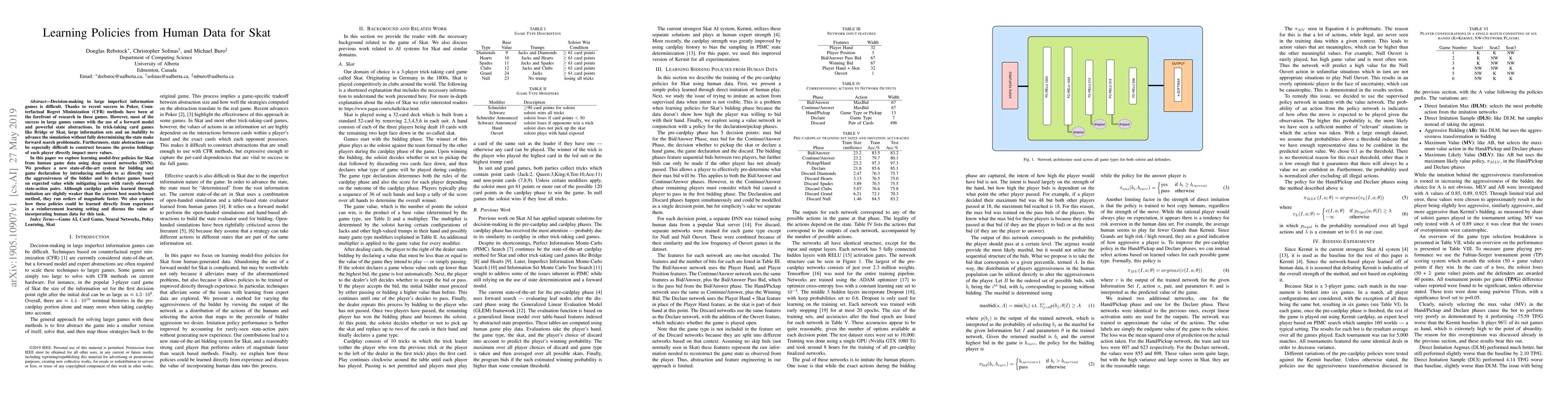 Decision-making in large imperfect information games is difficult. Thanks to recent success in Poker, Counterfactual Regret Minimization (CFR) methods have been at the forefront of research in these games. However, most of the success in large games comes with the use of a forward model and powerful state abstractions. In trick-taking card games like Bridge or Skat, large information sets and an inability to advance the simulation without fully determinizing the state make forward search problematic. Furthermore, state abstractions can be especially difficult to construct because the precise holdings of each player directly impact move values. In this paper we explore learning model-free policies for Skat from human game data using deep neural networks (DNN). We produce a new state-of-the-art system for bidding and game declaration by introducing methods to a) directly vary the aggressiveness of the bidder and b) declare games based on expected value while mitigating issues with rarely observed state-action pairs. Although cardplay policies learned through imitation are slightly weaker than the current best search-based method, they run orders of magnitude faster. We also explore how these policies could be learned directly from experience in a reinforcement learning setting and discuss the value of incorporating human data for this task.