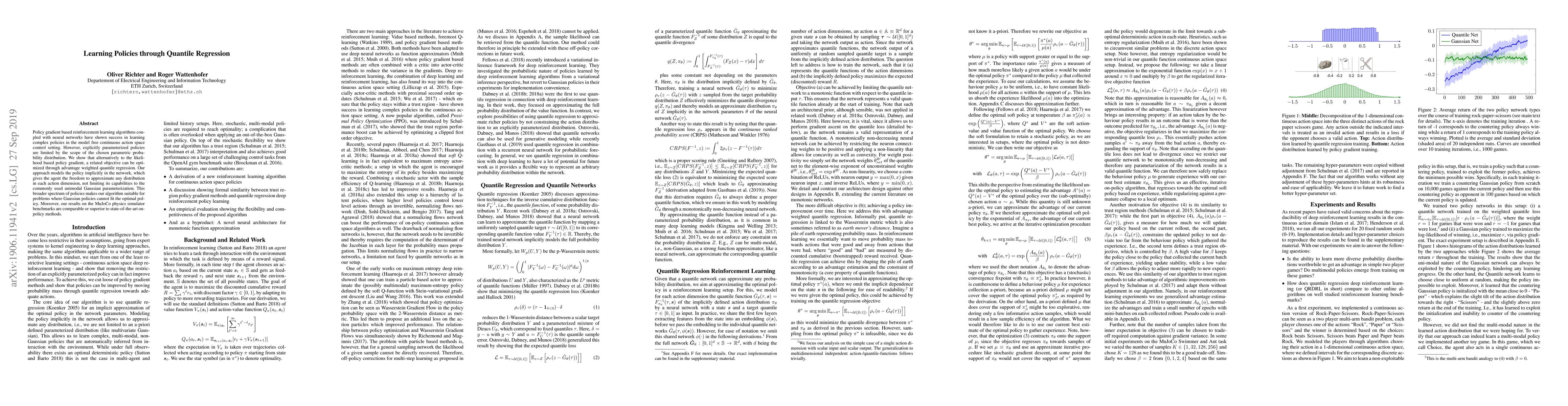 This research paper introduces a new approach to policy learning using quantile regression, which allows for more flexible policies than traditional Gaussian distributions, and achieves comparable results to state-of-the-art methods.