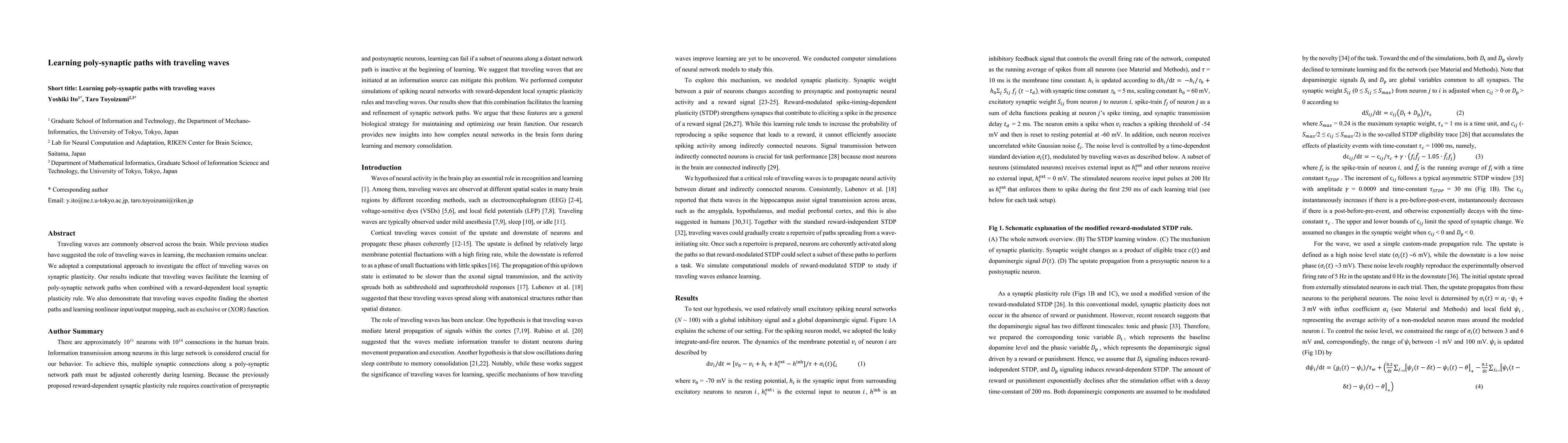 This study uses computational modeling to explore how traveling waves influence synaptic plasticity, finding that they enhance learning in poly-synaptic networks and expedite the learning of complex functions like the XOR, when paired with reward-dependent local plasticity rules.