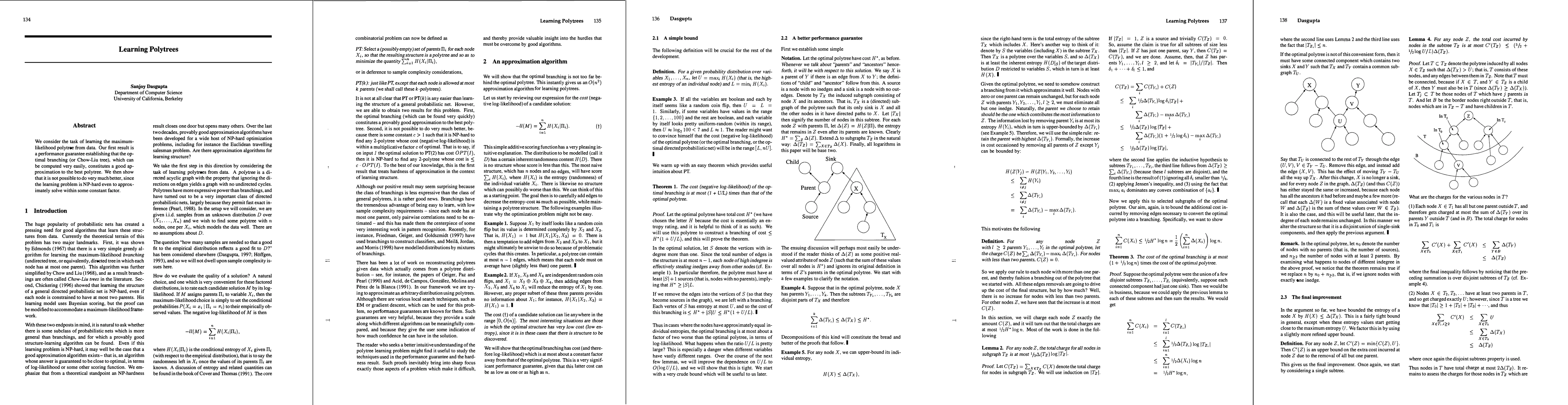 We consider the task of learning the maximum-likelihood polytree from data. Our first result is a performance guarantee establishing that the optimal branching (or Chow-Liu tree), which can be computed very easily, constitutes a good approximation to the best polytree. We then show that it is not possible to do very much better, since the learning problem is NP-hard even to approximately solve within some constant factor.