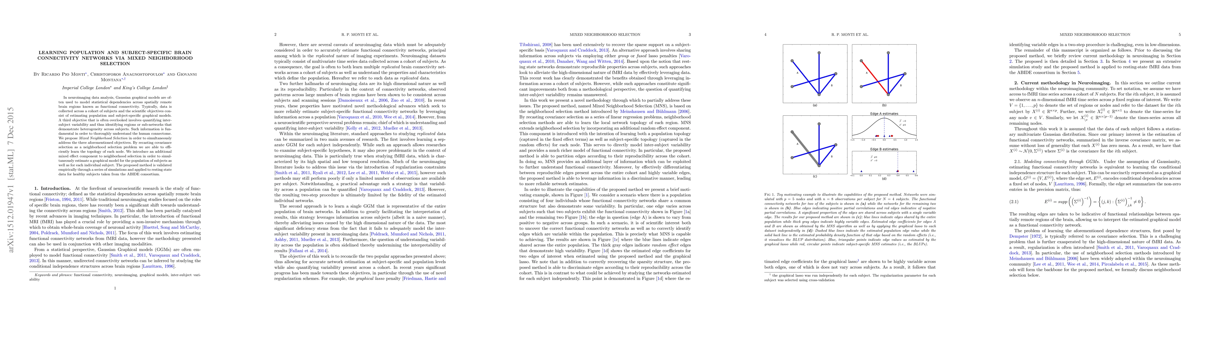 This paper proposes Mixed Neighborhood Selection to model brain connectivity networks, aiming to estimate population and subject-specific graphical models while quantifying inter-subject variability. The method recasts covariance selection as a neighborhood selection problem, introducing a mixed effect component to efficiently learn individual and population-level connectivity.