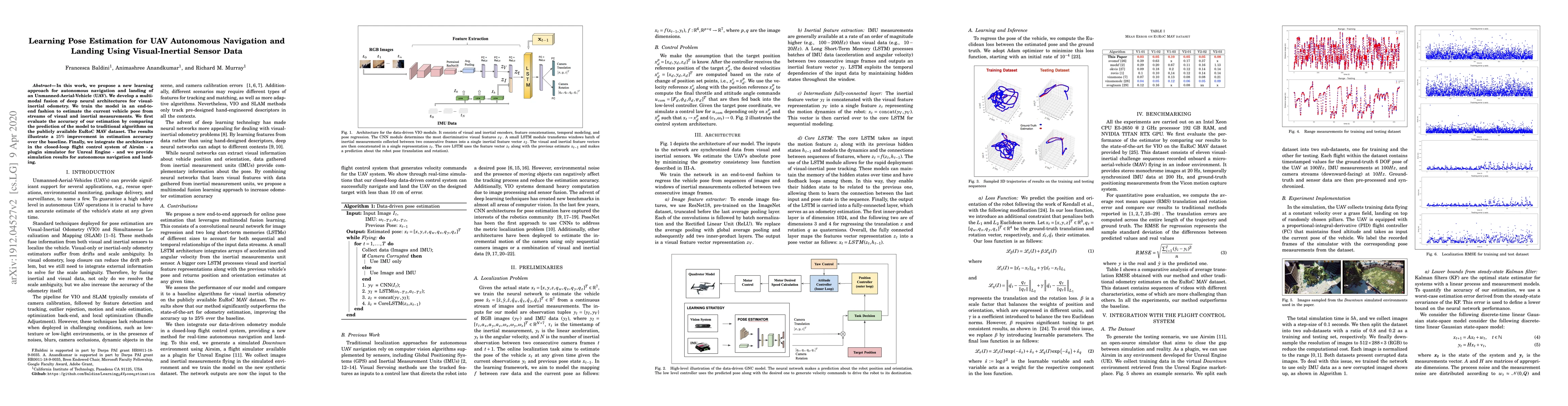 In this work, we propose a new learning approach for autonomous navigation and landing of an Unmanned-Aerial-Vehicle (UAV). We develop a multimodal fusion of deep neural architectures for visual-inertial odometry. We train the model in an end-to-end fashion to estimate the current vehicle pose from streams of visual and inertial measurements. We first evaluate the accuracy of our estimation by comparing the prediction of the model to traditional algorithms on the publicly available EuRoC MAV dataset. The results illustrate a $25 \%$ improvement in estimation accuracy over the baseline. Finally, we integrate the architecture in the closed-loop flight control system of Airsim - a plugin simulator for Unreal Engine - and we provide simulation results for autonomous navigation and landing.