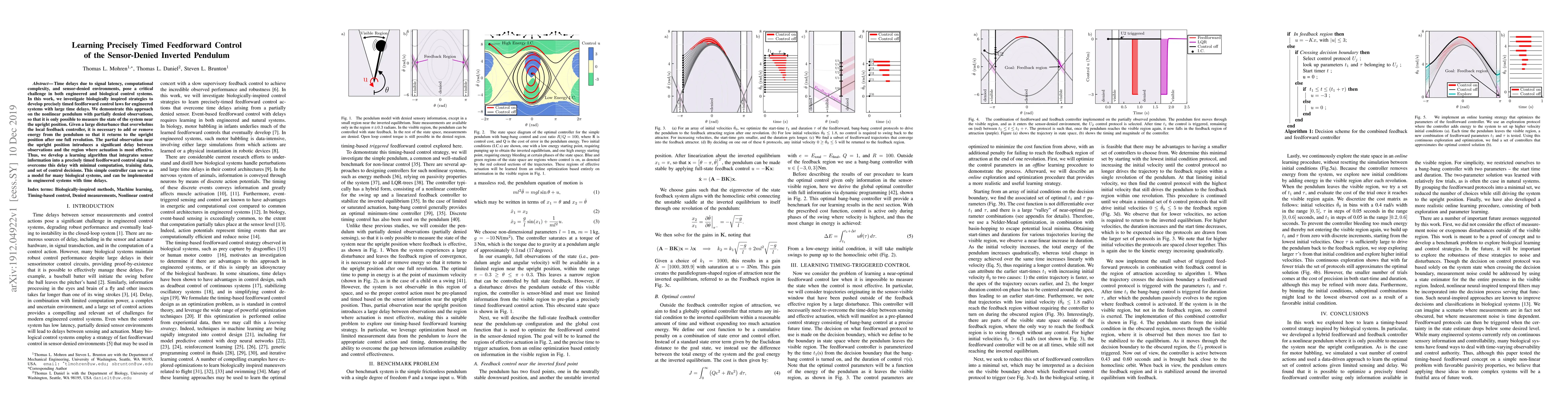 This paper explores biologically inspired strategies to create precisely timed feedforward control laws for systems with significant time delays, demonstrated through the control of an inverted pendulum with limited sensor observations. The developed learning algorithm integrates sensor data to generate effective control signals, overcoming delays and serving as a model for both biological and engineered systems.
