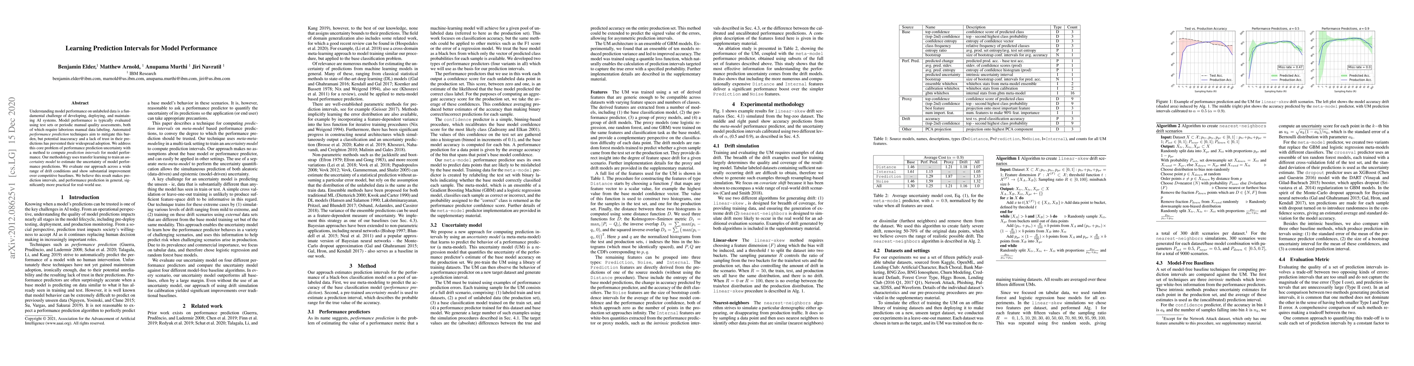 Understanding model performance on unlabeled data is a fundamental challenge of developing, deploying, and maintaining AI systems. Model performance is typically evaluated using test sets or periodic manual quality assessments, both of which require laborious manual data labeling. Automated performance prediction techniques aim to mitigate this burden, but potential inaccuracy and a lack of trust in their predictions has prevented their widespread adoption. We address this core problem of performance prediction uncertainty with a method to compute prediction intervals for model performance. Our methodology uses transfer learning to train an uncertainty model to estimate the uncertainty of model performance predictions. We evaluate our approach across a wide range of drift conditions and show substantial improvement over competitive baselines. We believe this result makes prediction intervals, and performance prediction in general, significantly more practical for real-world use.