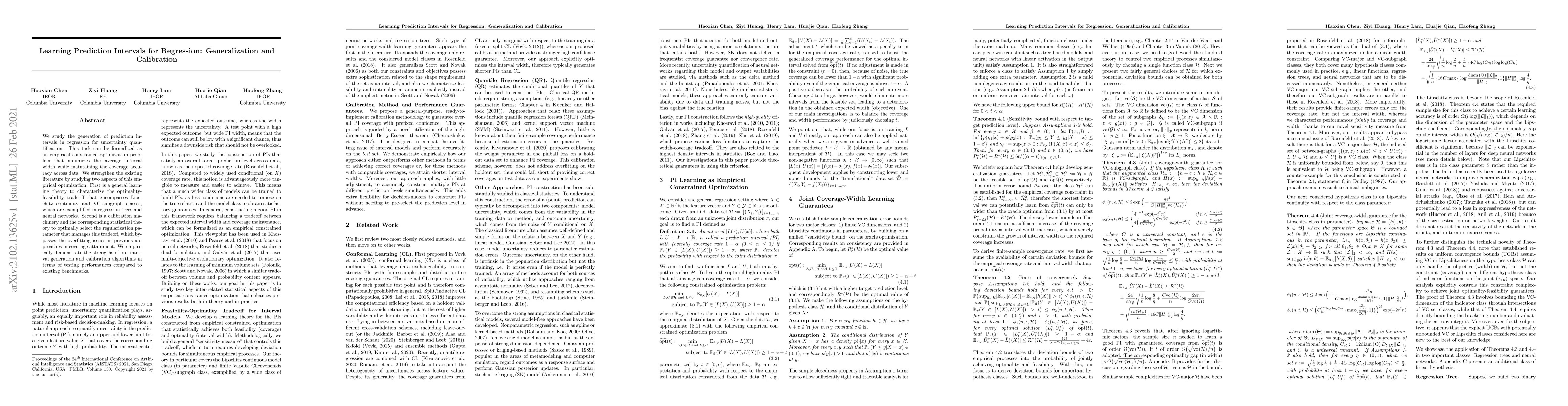 We study the generation of prediction intervals in regression for uncertainty quantification. This task can be formalized as an empirical constrained optimization problem that minimizes the average interval width while maintaining the coverage accuracy across data. We strengthen the existing literature by studying two aspects of this empirical optimization. First is a general learning theory to characterize the optimality-feasibility tradeoff that encompasses Lipschitz continuity and VC-subgraph classes, which are exemplified in regression trees and neural networks. Second is a calibration machinery and the corresponding statistical theory to optimally select the regularization parameter that manages this tradeoff, which bypasses the overfitting issues in previous approaches in coverage attainment. We empirically demonstrate the strengths of our interval generation and calibration algorithms in terms of testing performances compared to existing benchmarks.