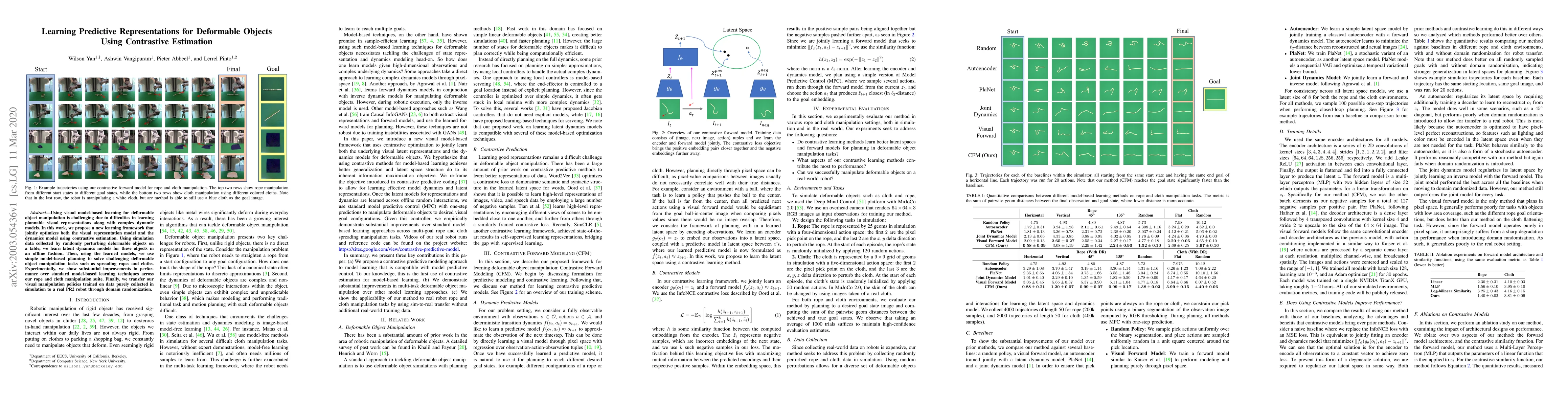 This paper proposes a framework for learning predictive representations for deformable objects by jointly optimizing visual representation and dynamics models using contrastive estimation. The approach demonstrates significant improvements in deformable object manipulation tasks and successfully transfers learned policies to a real robot via domain randomization.