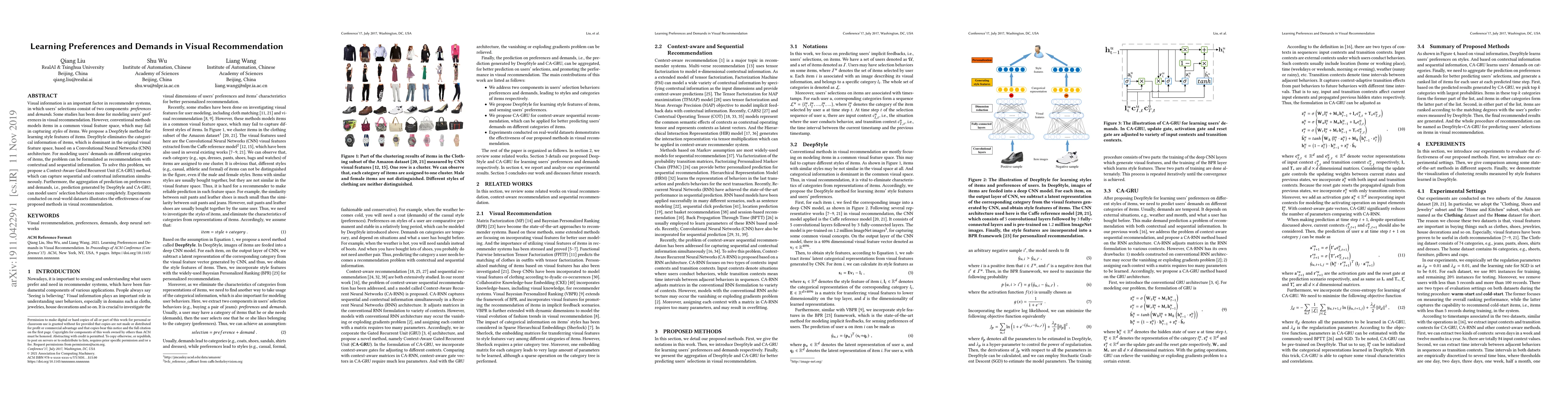 Visual information is an important factor in recommender systems, in which users' selections consist of two components: \emph{preferences} and \emph{demands}. Some studies has been done for modeling users' preferences in visual recommendation. However, conventional methods models items in a common visual feature space, which may fail in capturing \emph{styles} of items. We propose a DeepStyle method for learning style features of items. DeepStyle eliminates the categorical information of items, which is dominant in the original visual feature space, based on a Convolutional Neural Networks (CNN) architecture. For modeling users' demands on different categories of items, the problem can be formulated as recommendation with contextual and sequential information. To solve this problem, we propose a Context-Aware Gated Recurrent Unit (CA-GRU) method, which can capture sequential and contextual information simultaneously. Furthermore, the aggregation of prediction on preferences and demands, i.e., prediction generated by DeepStyle and CA-GRU, can model users' selection behaviors more completely. Experiments conducted on real-world datasets illustrates the effectiveness of our proposed methods in visual recommendation.