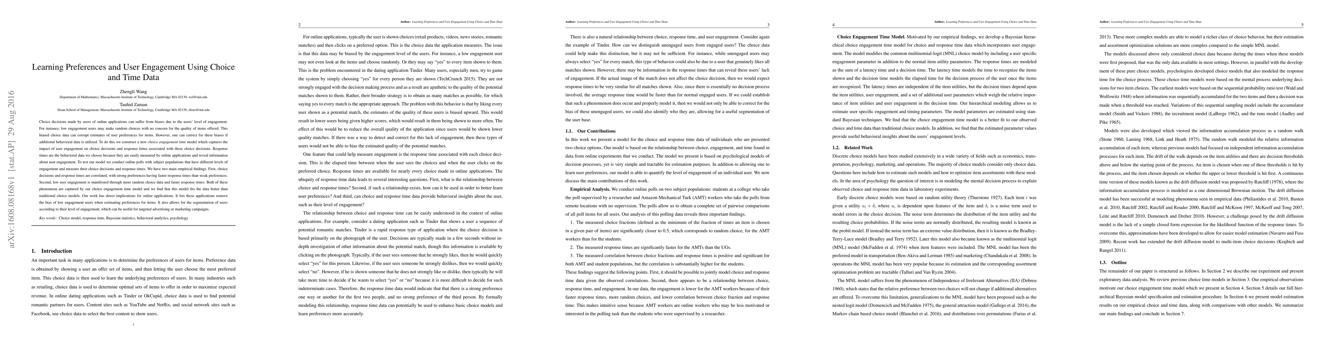 This paper develops a new choice engagement time model to correct biases in user preference estimates due to low engagement, using response times as behavioral data. Empirical findings show that strong preferences correlate with faster response times, and low engagement leads to more random choices and quicker responses, better captured by the proposed model than traditional ones.