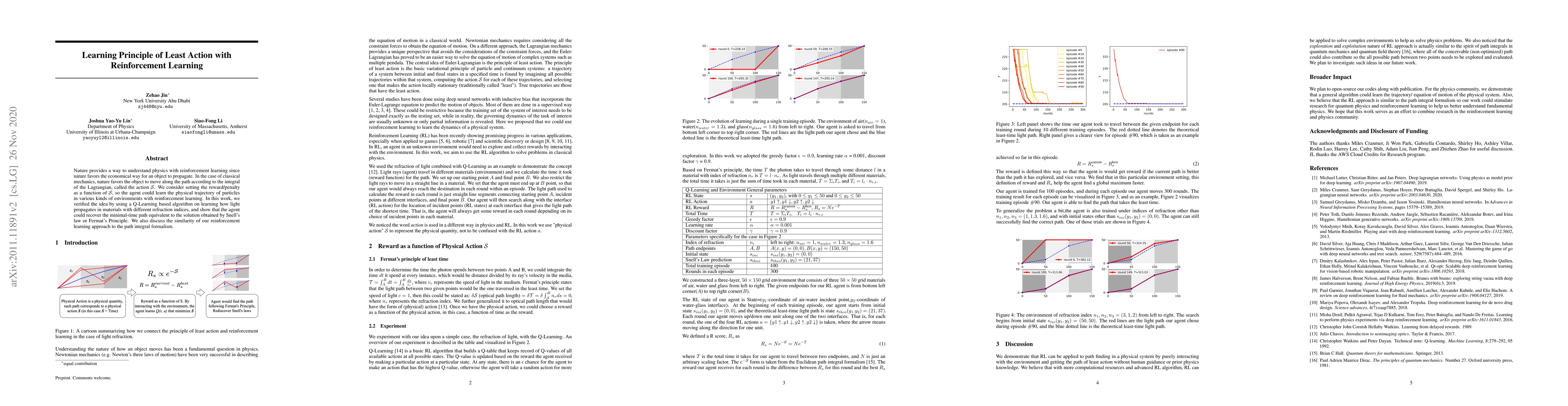 Nature provides a way to understand physics with reinforcement learning since nature favors the economical way for an object to propagate. In the case of classical mechanics, nature favors the object to move along the path according to the integral of the Lagrangian, called the action $\mathcal{S}$. We consider setting the reward/penalty as a function of $\mathcal{S}$, so the agent could learn the physical trajectory of particles in various kinds of environments with reinforcement learning. In this work, we verified the idea by using a Q-Learning based algorithm on learning how light propagates in materials with different refraction indices, and show that the agent could recover the minimal-time path equivalent to the solution obtained by Snell's law or Fermat's Principle. We also discuss the similarity of our reinforcement learning approach to the path integral formalism.