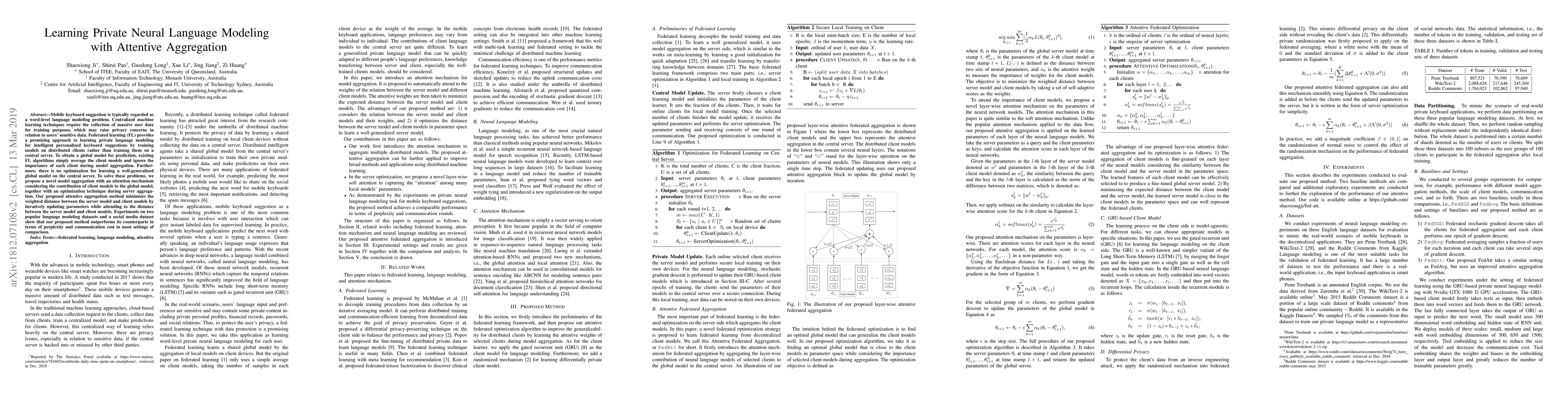 This paper proposes an attentive aggregation method for federated learning to improve private neural language modeling for mobile keyboard suggestions. The method optimizes the global model by considering the contribution of each client, outperforming existing averaging techniques in perplexity and communication cost.