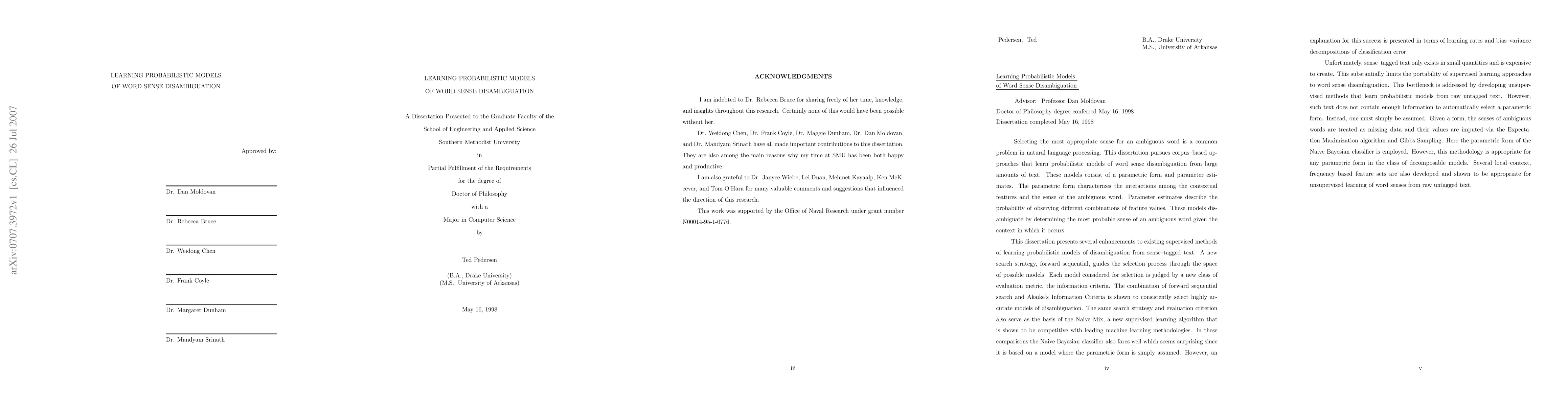 This dissertation introduces advanced supervised and unsupervised learning methods for word sense disambiguation, with the Naive Bayesian model proving particularly effective. The study explains its success through learning rates and bias-variance decompositions.