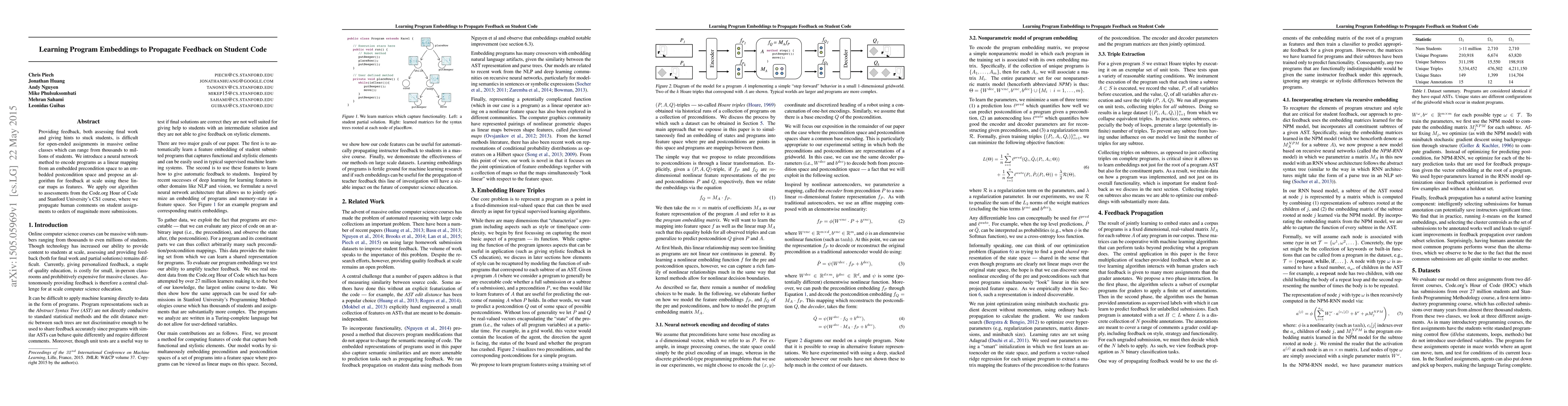 Providing feedback, both assessing final work and giving hints to stuck students, is difficult for open-ended assignments in massive online classes which can range from thousands to millions of students. We introduce a neural network method to encode programs as a linear mapping from an embedded precondition space to an embedded postcondition space and propose an algorithm for feedback at scale using these linear maps as features. We apply our algorithm to assessments from the Code.org Hour of Code and Stanford University's CS1 course, where we propagate human comments on student assignments to orders of magnitude more submissions.