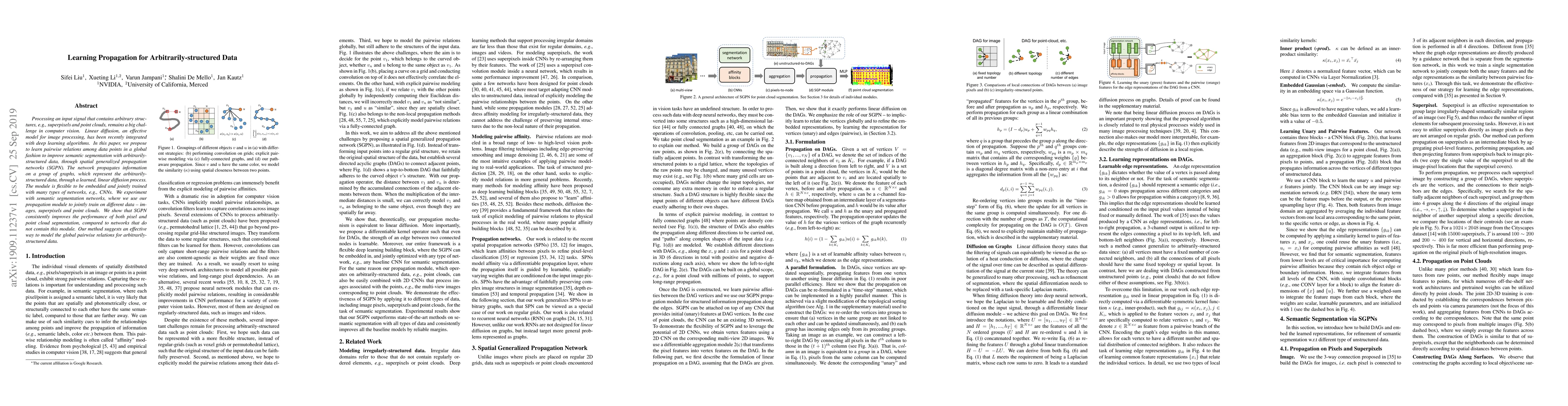 This paper proposes spatial generalized propagation networks (SGPN) to learn pairwise relations among data points for improving semantic segmentation of arbitrarily-structured data, such as superpixels and point clouds. The method integrates a linear diffusion process to propagate information across multiple graph representations, enhancing performance in segmentation tasks when embedded with CNNs.
