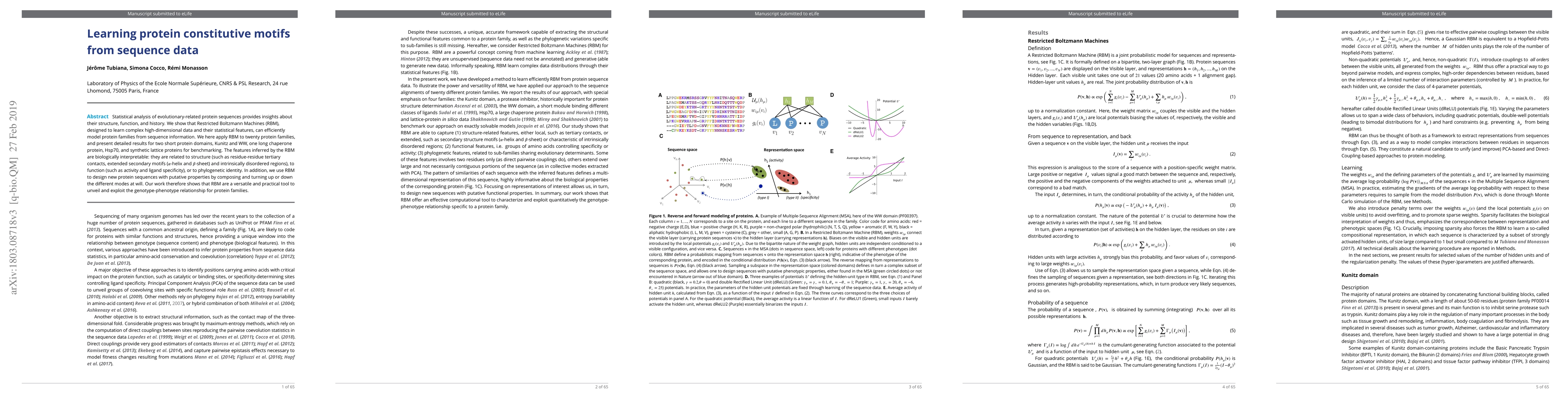 This paper demonstrates that Restricted Boltzmann Machines (RBM) can effectively model protein families from sequence data, revealing insights into their structure, function, and evolutionary history. The study applies RBM to various protein families and shows that the inferred features are biologically meaningful and can be used to design new protein sequences with desired properties.