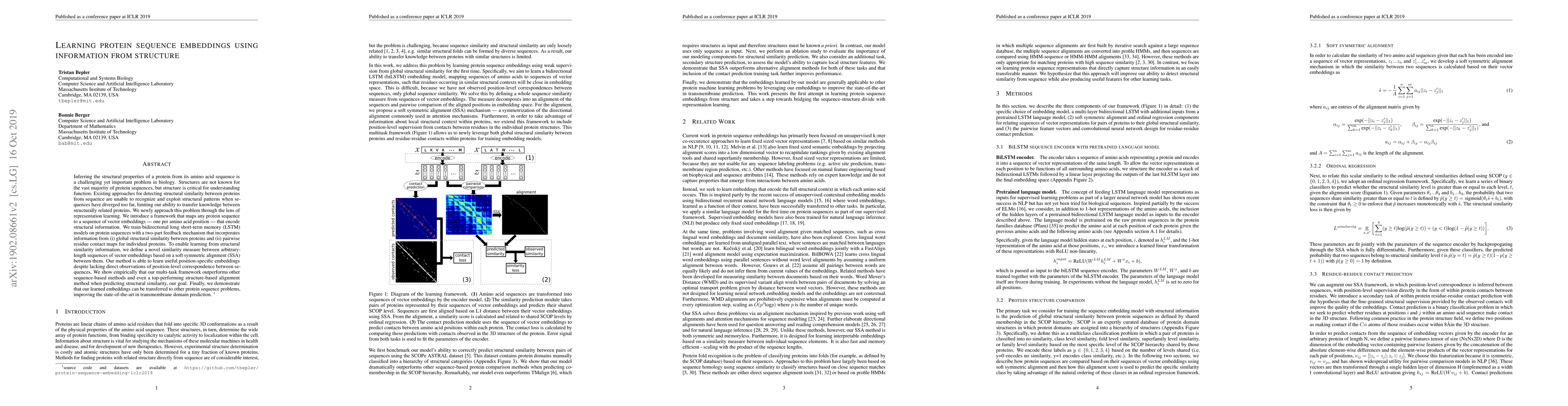 This research develops a framework to map protein sequences to embeddings that encode structural information, using bidirectional LSTMs trained on structural similarity and residue contact maps. The embeddings outperform existing methods in predicting structural similarity and enhance performance in transmembrane domain prediction.