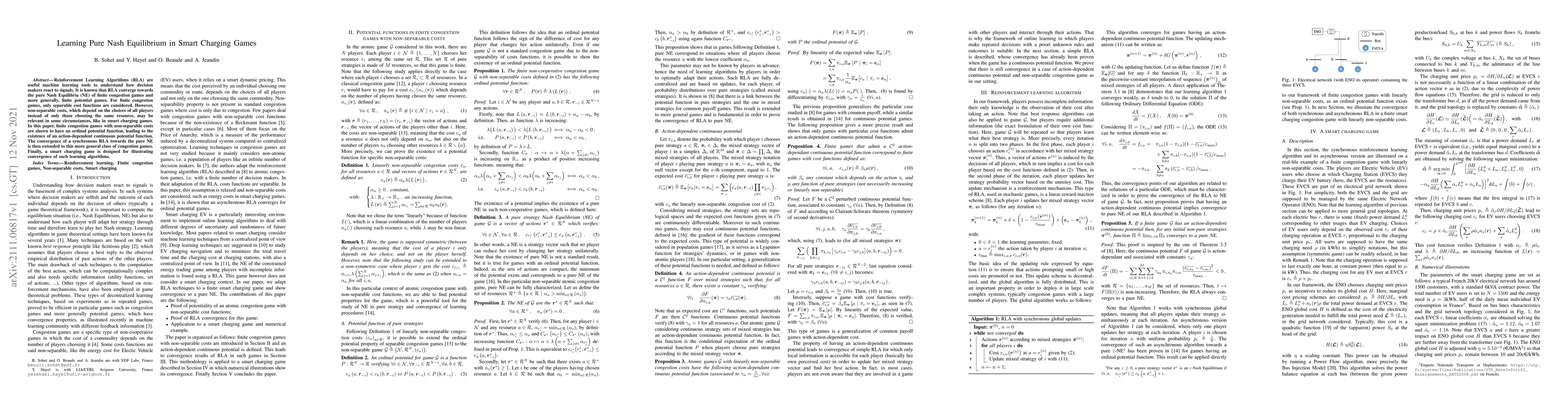 Researchers show that reinforcement learning algorithms can converge to pure Nash Equilibrium in smart charging games with non-separable costs, extending previous findings on finite congestion games.
