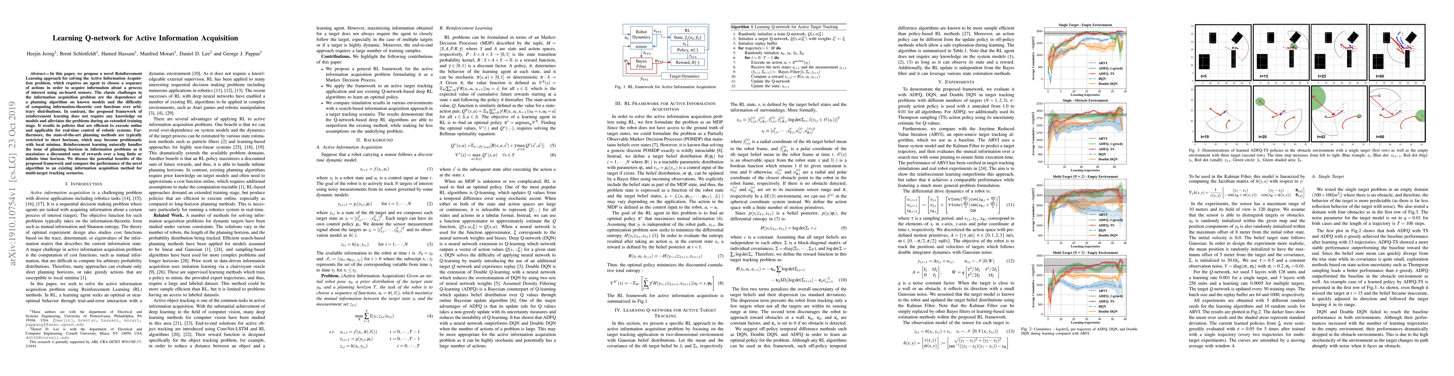 In this paper, we propose a novel Reinforcement Learning approach for solving the Active Information Acquisition problem, which requires an agent to choose a sequence of actions in order to acquire information about a process of interest using on-board sensors. The classic challenges in the information acquisition problem are the dependence of a planning algorithm on known models and the difficulty of computing information-theoretic cost functions over arbitrary distributions. In contrast, the proposed framework of reinforcement learning does not require any knowledge on models and alleviates the problems during an extended training stage. It results in policies that are efficient to execute online and applicable for real-time control of robotic systems. Furthermore, the state-of-the-art planning methods are typically restricted to short horizons, which may become problematic with local minima. Reinforcement learning naturally handles the issue of planning horizon in information problems as it maximizes a discounted sum of rewards over a long finite or infinite time horizon. We discuss the potential benefits of the proposed framework and compare the performance of the novel algorithm to an existing information acquisition method for multi-target tracking scenarios.
