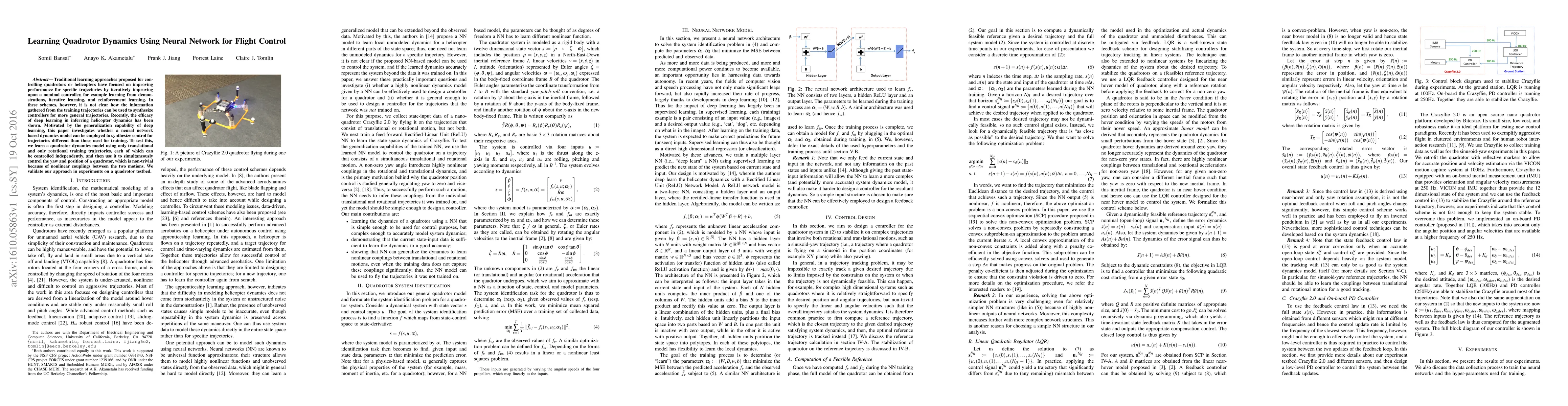 This paper explores the use of neural networks to model quadrotor dynamics for flight control, demonstrating the ability to generalize from specific training trajectories to control non-trivial combined motions like yaw and position. Experiments on a quadrotor testbed validate the effectiveness of the proposed neural network-based dynamics model.