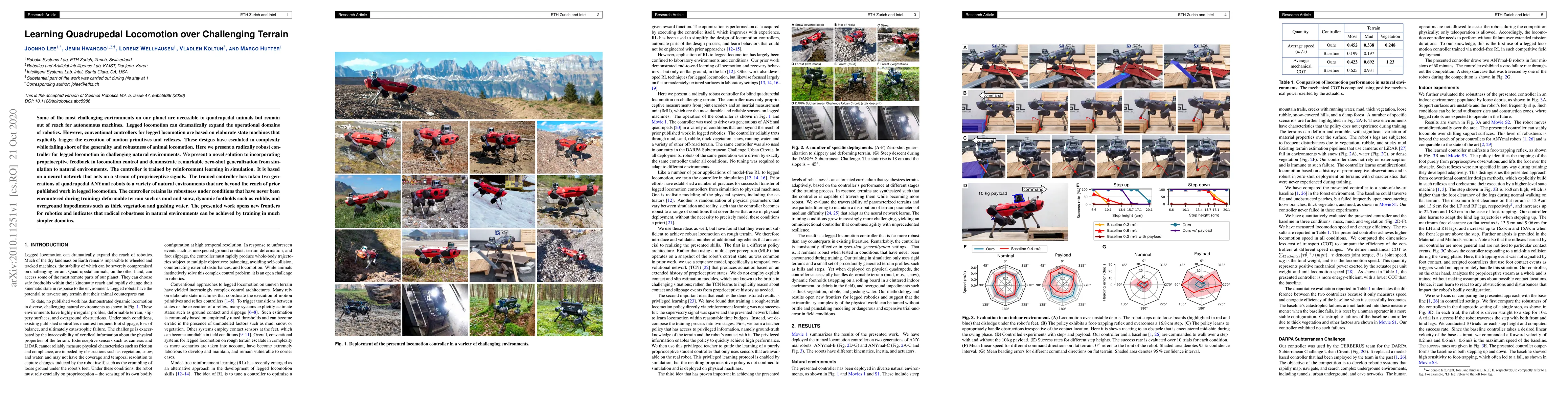 This research develops a neural network-based controller for quadrupedal robots, trained via reinforcement learning, that achieves robust locomotion in challenging natural environments by leveraging proprioceptive feedback and demonstrating zero-shot generalization from simulation to real-world conditions. The ANYmal robots successfully navigate deformable terrains and dynamic obstacles, showcasing significant advancements in legged locomotion.