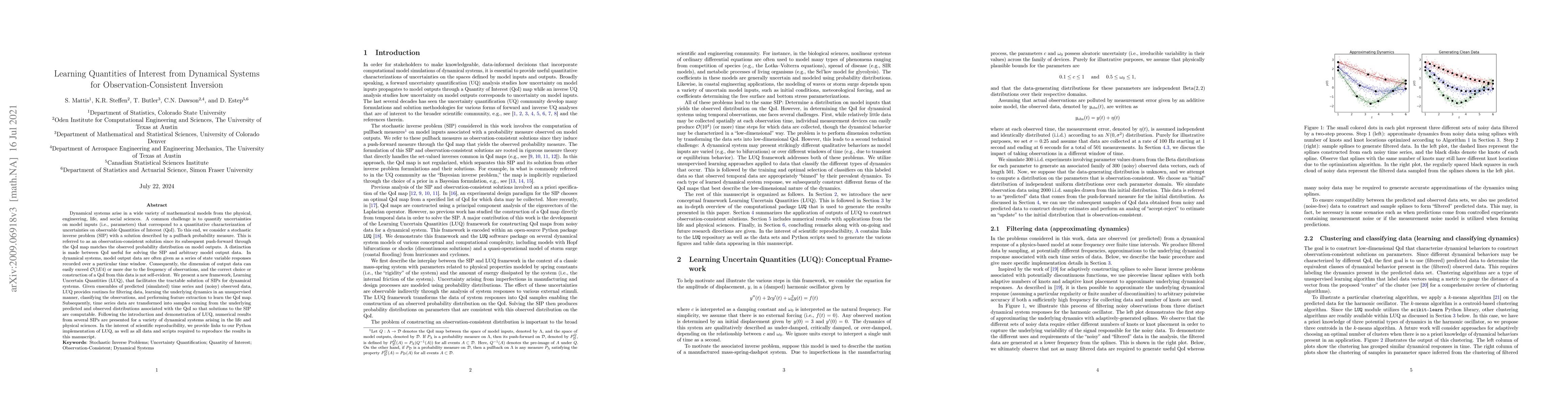This research introduces a framework called Learning Uncertain Quantities (LUQ) to address the challenge of quantifying uncertainties in model inputs for dynamical systems. LUQ facilitates tractable solutions to stochastic inverse problems (SIP) by filtering data, learning underlying dynamics, classifying observations, and extracting features to determine Quantities of Interest (QoI). The method is demonstrated with numerical results from various dynamical systems in life and physical sciences, with Python code and data provided for reproducibility.