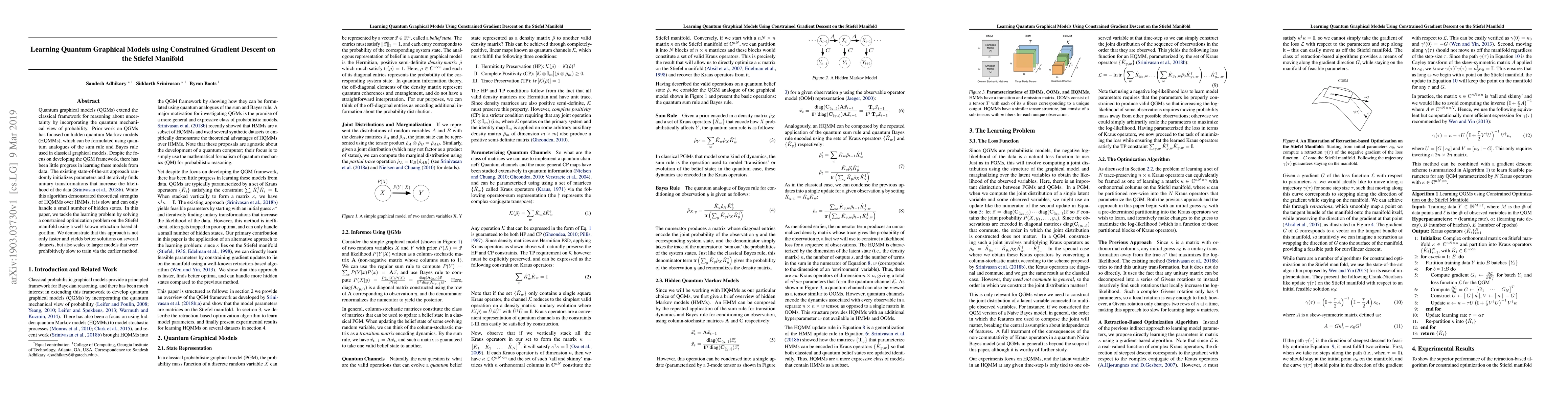 This paper proposes a new method for learning quantum graphical models using constrained gradient descent on the Stiefel manifold, which is faster and more scalable than existing random initialization techniques. The approach leverages a retraction-based algorithm to solve the optimization problem, demonstrating improved performance on multiple datasets.