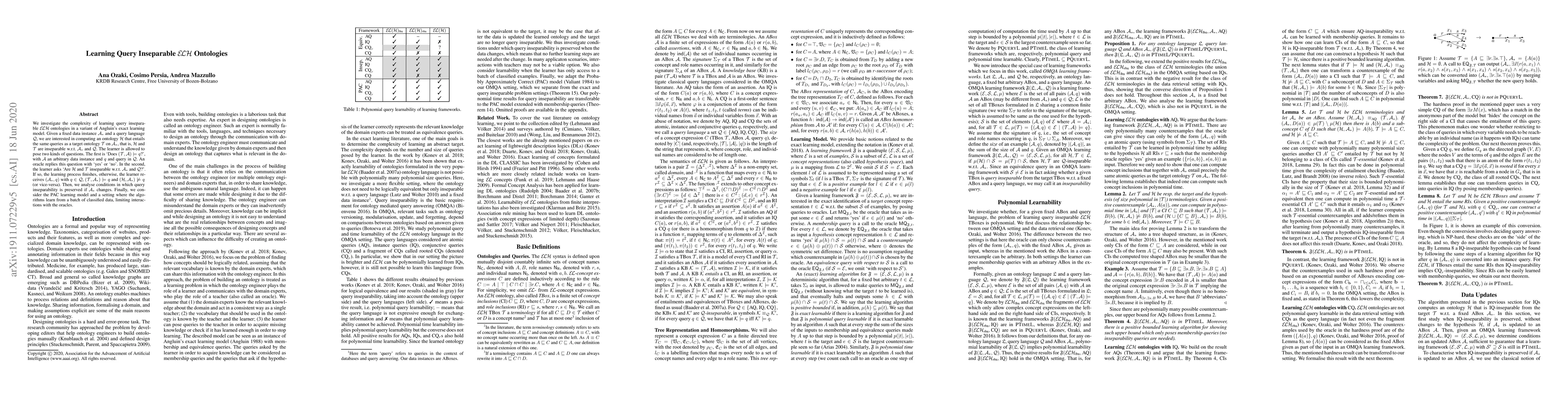 We investigate the complexity of learning query inseparable ELH ontologies in a variant of Angluin's exact learning model. Given a fixed data instance A* and a query language Q, we are interested in computing an ontology H that entails the same queries as a target ontology T on A*, that is, H and T are inseparable w.r.t. A* and Q. The learner is allowed to pose two kinds of questions. The first is `Does (T,A)\models q?', with A an arbitrary data instance and q and query in Q. An oracle replies this question with `yes' or `no'. In the second, the learner asks `Are H and T inseparable w.r.t. A* and Q?'. If so, the learning process finishes, otherwise, the learner receives (A*,q) with q in Q, (T,A*)\models q and (H,A*)\not\models q (or vice-versa). Then, we analyse conditions in which query inseparability is preserved if A* changes. Finally, we consider the PAC learning model and a setting where the algorithms learn from a batch of classified data, limiting interactions with the oracles.