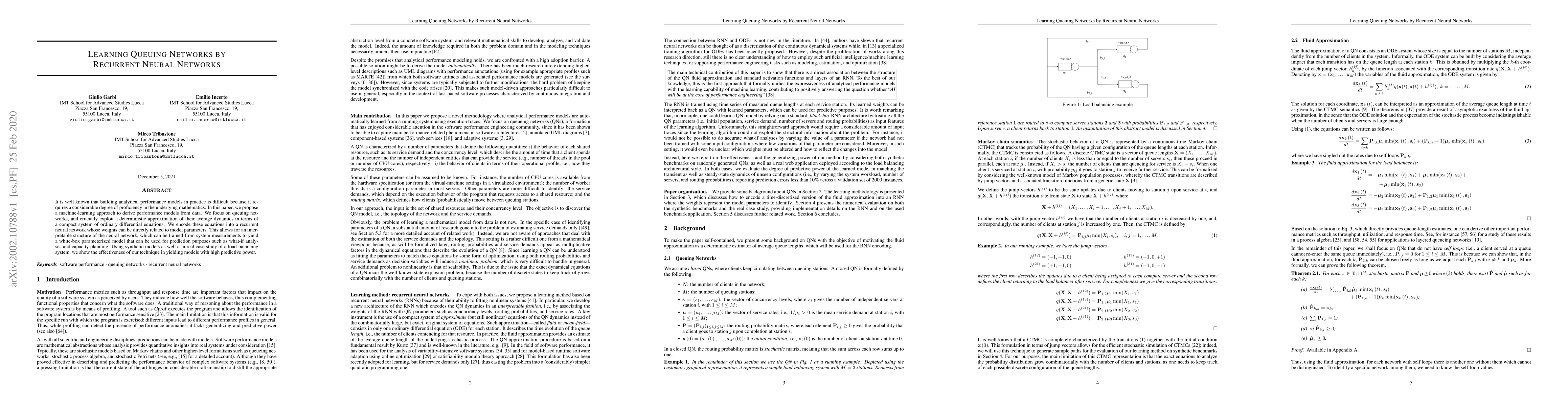 This paper proposes a machine-learning method to derive performance models for queuing networks using recurrent neural networks. The approach leverages a deterministic approximation of queuing dynamics, enabling an interpretable neural network structure that can be trained from data for accurate prediction and analysis.