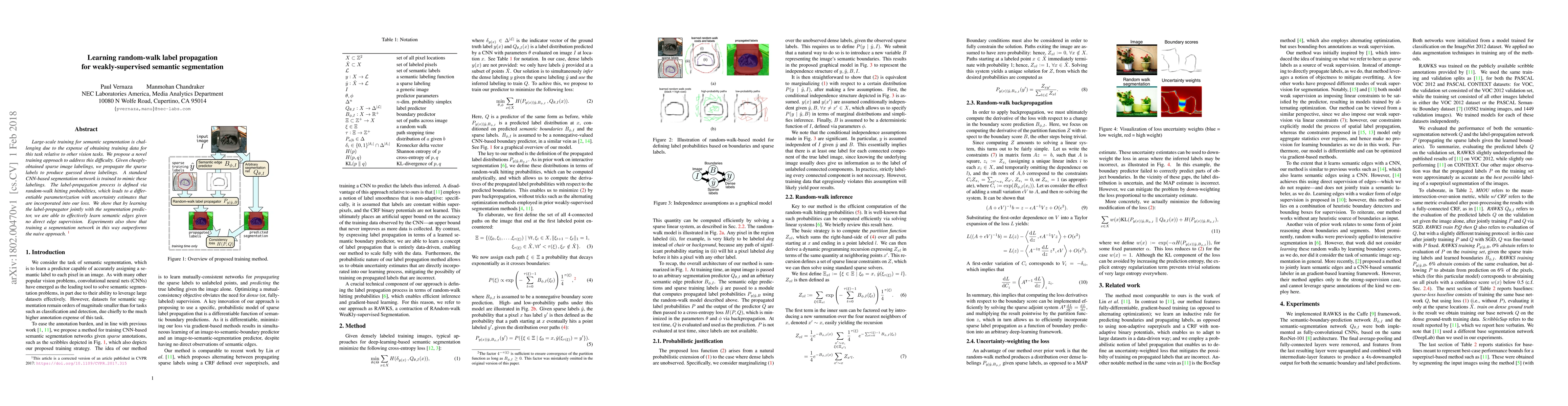 This paper introduces a novel method for weakly-supervised semantic segmentation using random-walk label propagation. It leverages sparse image labels to generate dense labelings, which are then used to train a CNN-based segmentation network. The approach incorporates uncertainty estimates from random-walk hitting probabilities, leading to improved segmentation performance without direct edge supervision.