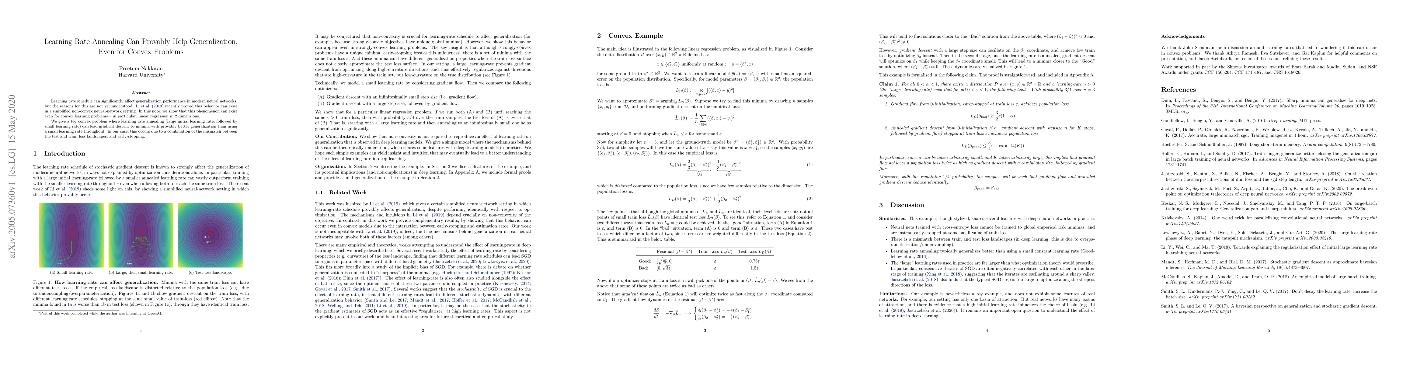 This paper demonstrates that learning rate annealing can improve generalization in convex problems, such as 2D linear regression, by showing gradient descent can find better minima due to the mismatch between test and train loss landscapes and early-stopping. This challenges the conventional wisdom that smaller learning rates are always better.