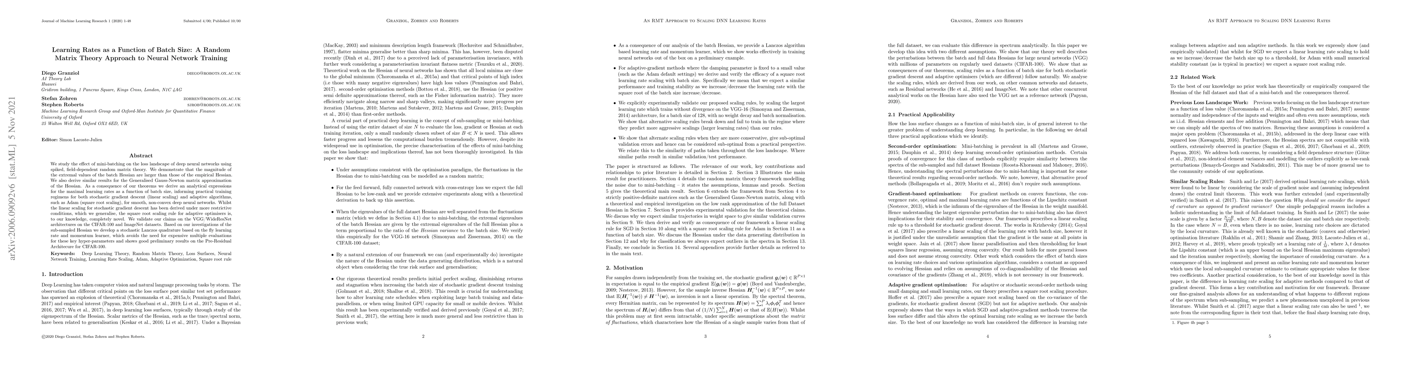 We study the effect of mini-batching on the loss landscape of deep neural networks using spiked, field-dependent random matrix theory. We demonstrate that the magnitude of the extremal values of the batch Hessian are larger than those of the empirical Hessian. We also derive similar results for the Generalised Gauss-Newton matrix approximation of the Hessian. As a consequence of our theorems we derive an analytical expressions for the maximal learning rates as a function of batch size, informing practical training regimens for both stochastic gradient descent (linear scaling) and adaptive algorithms, such as Adam (square root scaling), for smooth, non-convex deep neural networks. Whilst the linear scaling for stochastic gradient descent has been derived under more restrictive conditions, which we generalise, the square root scaling rule for adaptive optimisers is, to our knowledge, completely novel. %For stochastic second-order methods and adaptive methods, we derive that the minimal damping coefficient is proportional to the ratio of the learning rate to batch size. We validate our claims on the VGG/WideResNet architectures on the CIFAR-$100$ and ImageNet datasets. Based on our investigations of the sub-sampled Hessian we develop a stochastic Lanczos quadrature based on the fly learning rate and momentum learner, which avoids the need for expensive multiple evaluations for these key hyper-parameters and shows good preliminary results on the Pre-Residual Architecure for CIFAR-$100$.