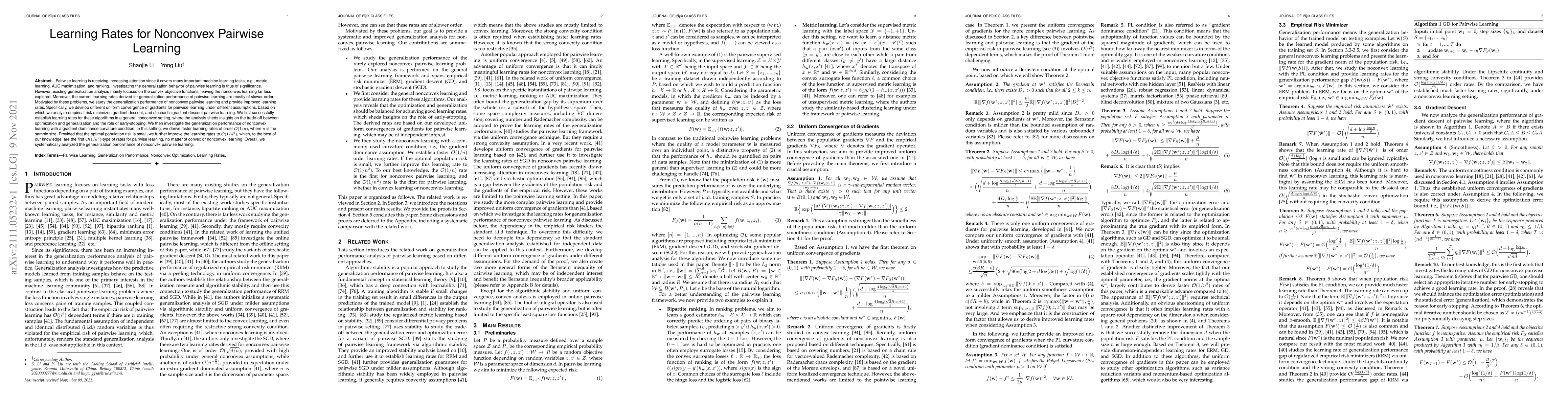 This paper studies nonconvex pairwise learning, improving learning rates for algorithms like gradient descent and stochastic gradient descent, and deriving faster rates of $ extcal{O}(1/n)$ or even $ extcal{O}(1/n^2)$ under specific conditions.