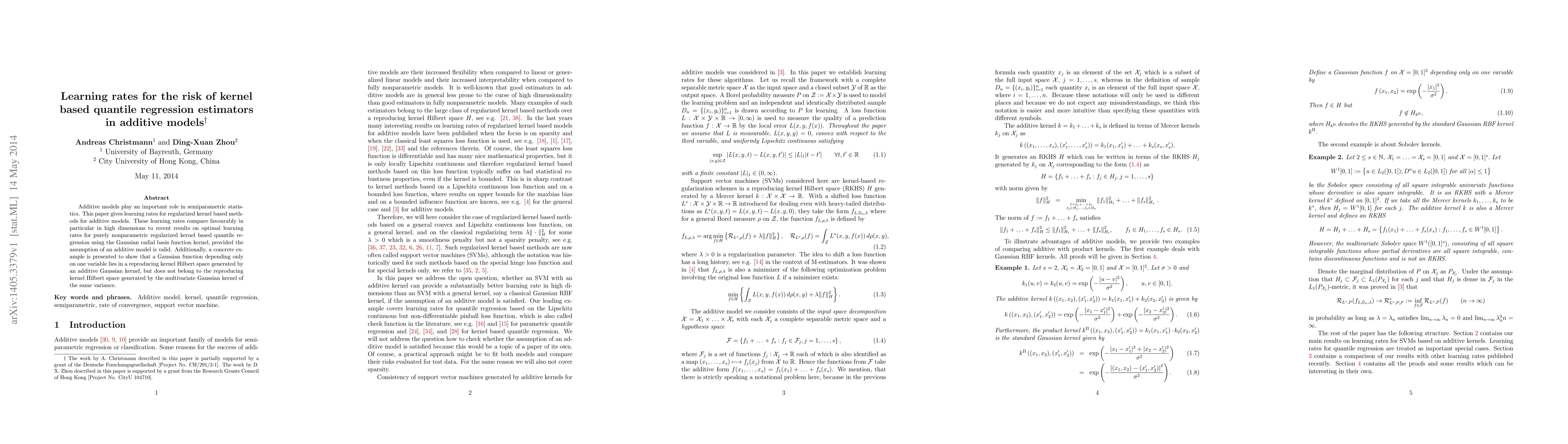 Additive models play an important role in semiparametric statistics. This paper gives learning rates for regularized kernel based methods for additive models. These learning rates compare favourably in particular in high dimensions to recent results on optimal learning rates for purely nonparametric regularized kernel based quantile regression using the Gaussian radial basis function kernel, provided the assumption of an additive model is valid. Additionally, a concrete example is presented to show that a Gaussian function depending only on one variable lies in a reproducing kernel Hilbert space generated by an additive Gaussian kernel, but does not belong to the reproducing kernel Hilbert space generated by the multivariate Gaussian kernel of the same variance.